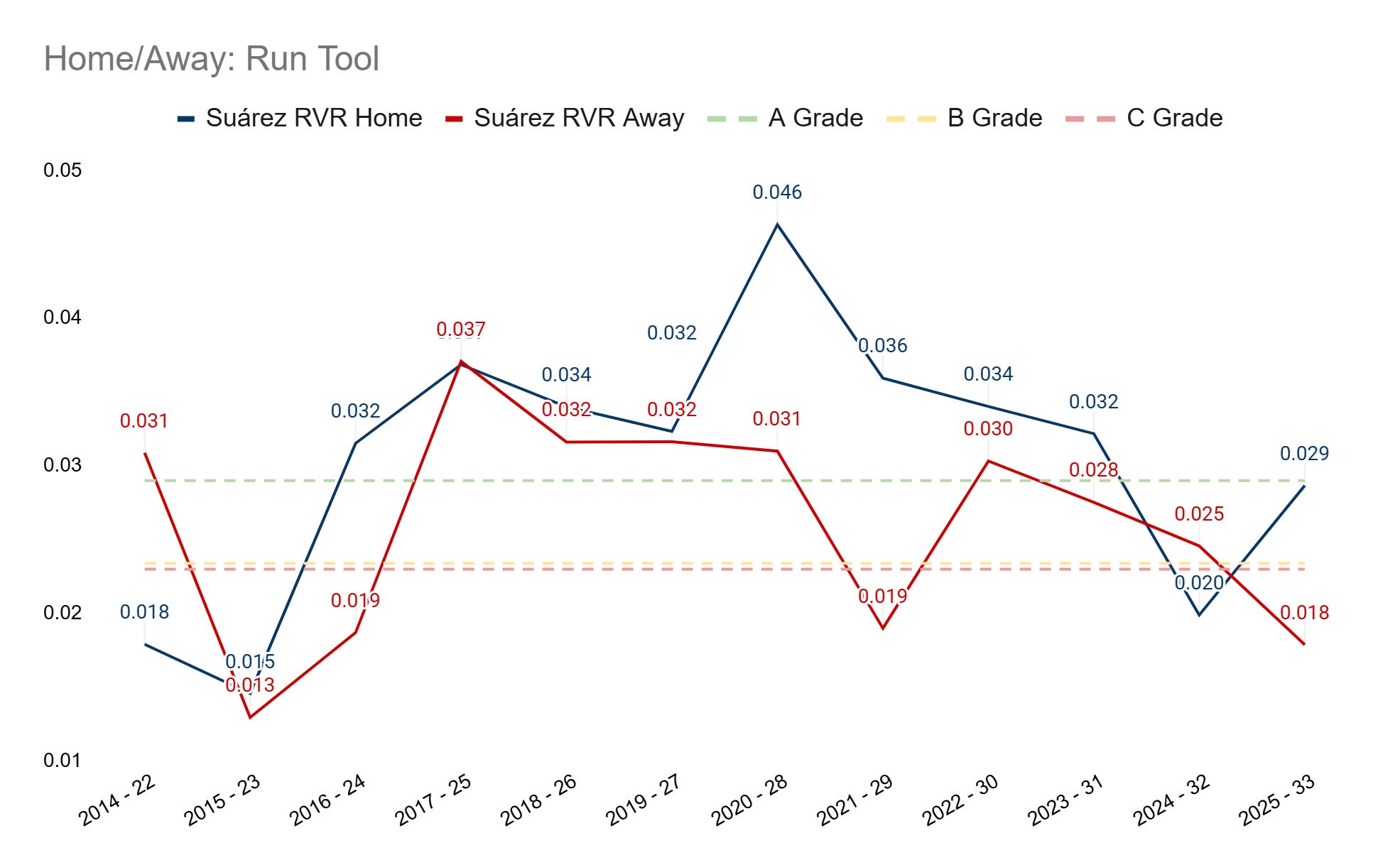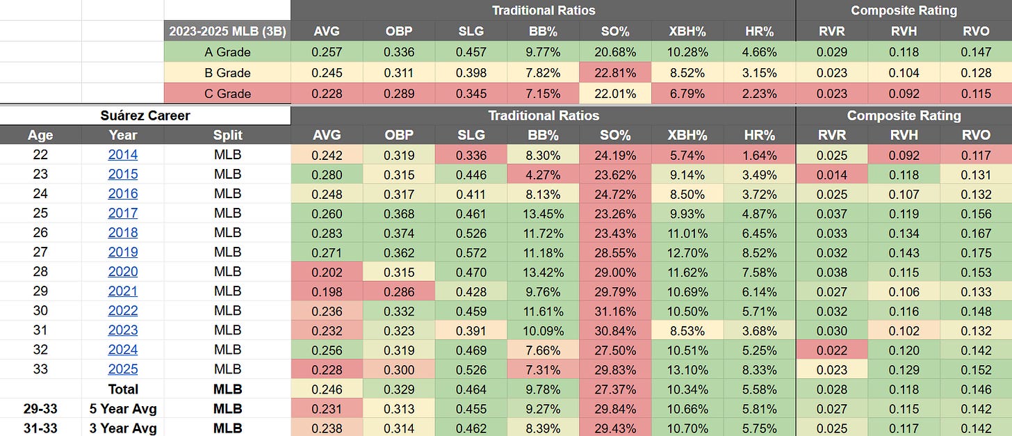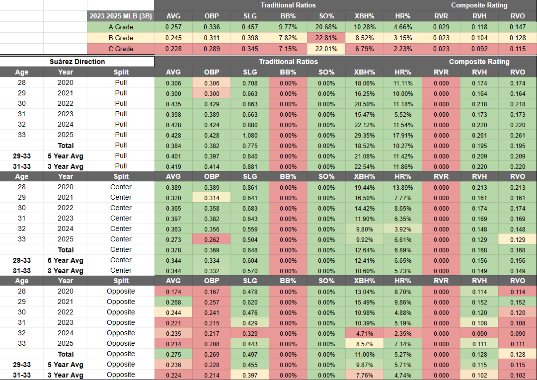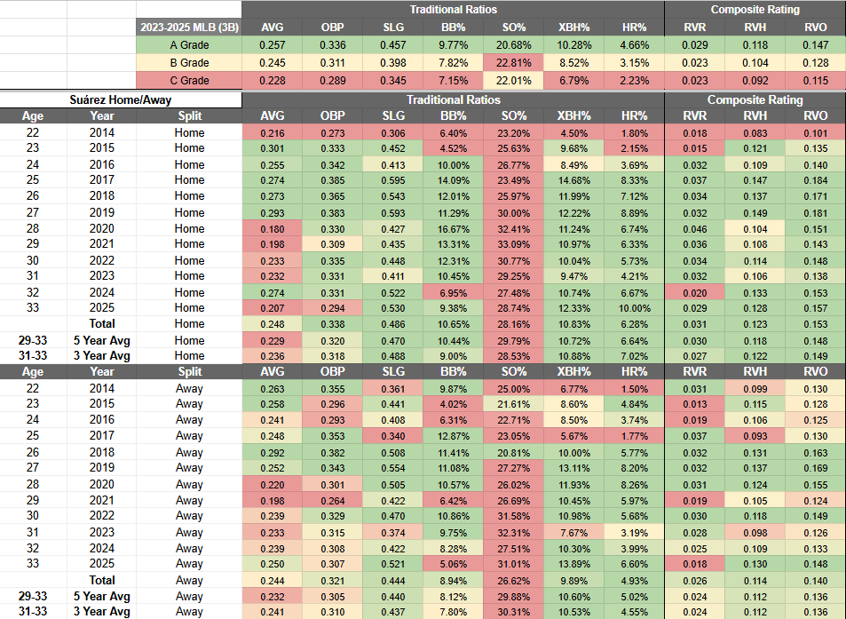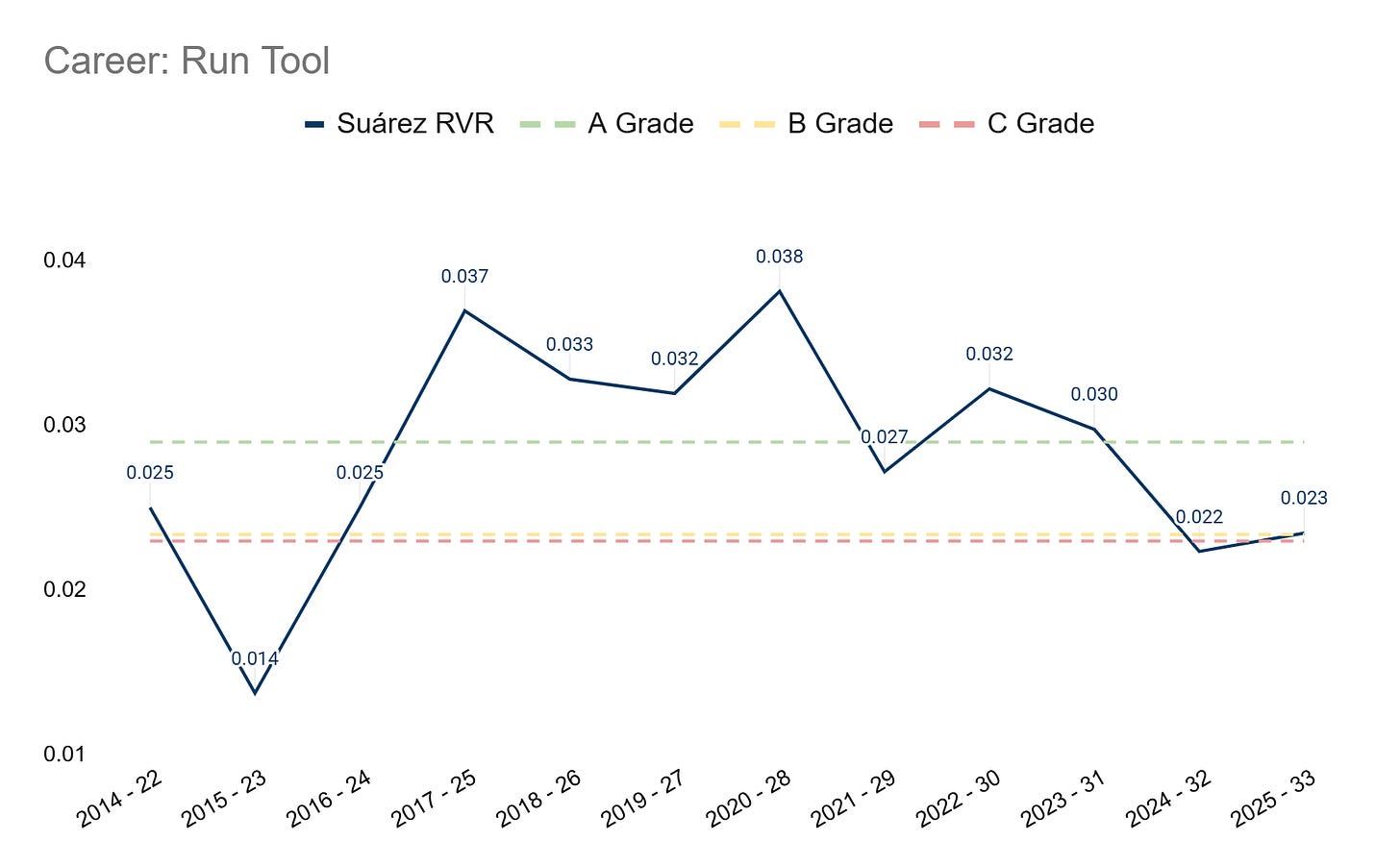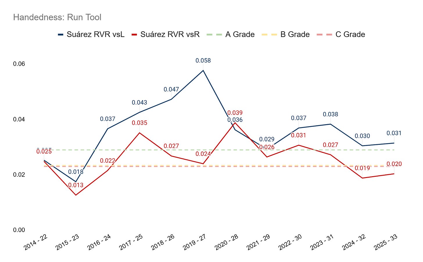 From a Overall production basis, he checks out and has shown the ability to adjust and sustain production later in his career despite not utilizing his Run Tool. This is a professional hitter, with a proven track record to make adjustments and knows himself. I am confident in Suárez’s Production, Bat and his ability to make adjustments. Despite turning 34 in July, I do not foresee a major drop in production in 2026 without a material change occurring.