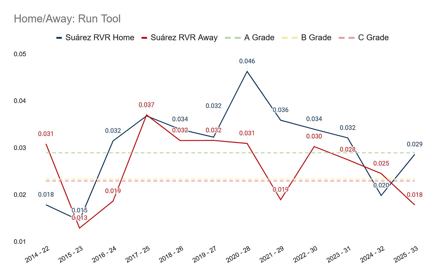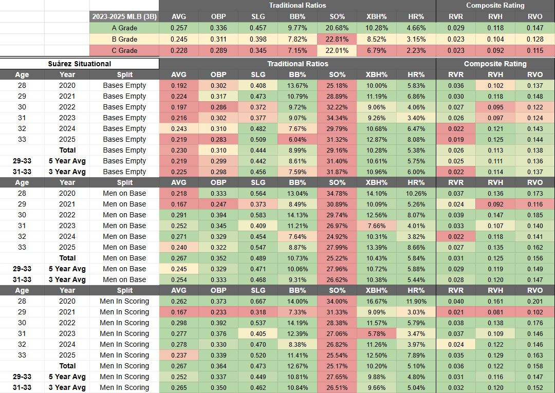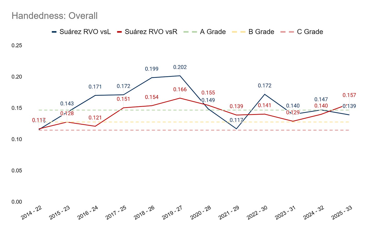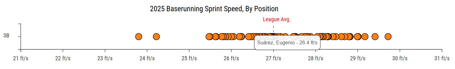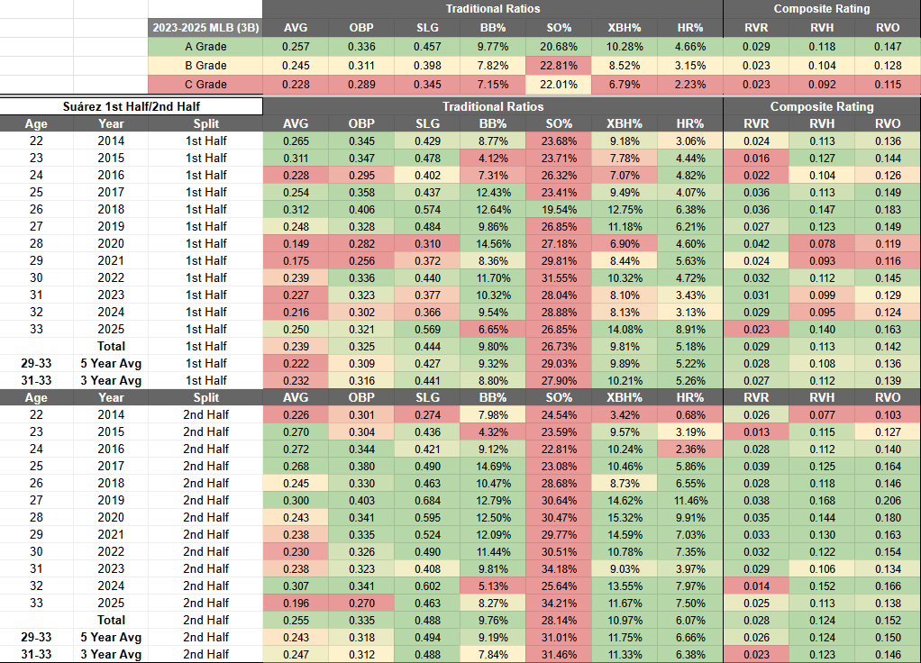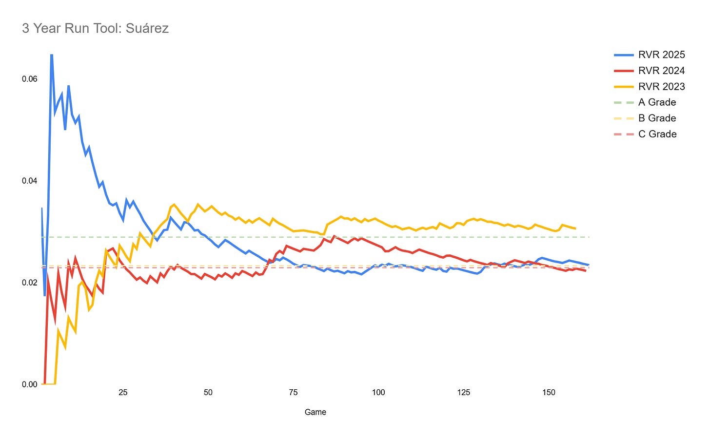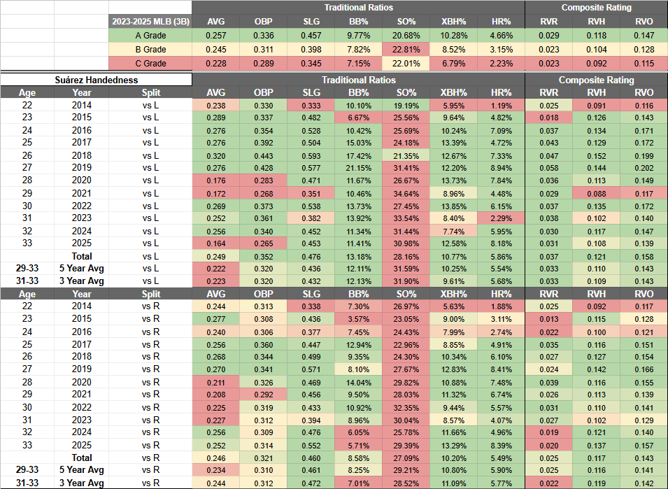 From a Overall production basis, he checks out and has shown the ability to adjust and sustain production later in his career despite not utilizing his Run Tool. This is a professional hitter, with a proven track record to make adjustments and knows himself. I am confident in Suárez’s Production, Bat and his ability to make adjustments. Despite turning 34 in July, I do not foresee a major drop in production in 2026 without a material change occurring.