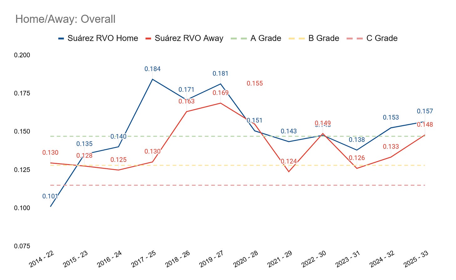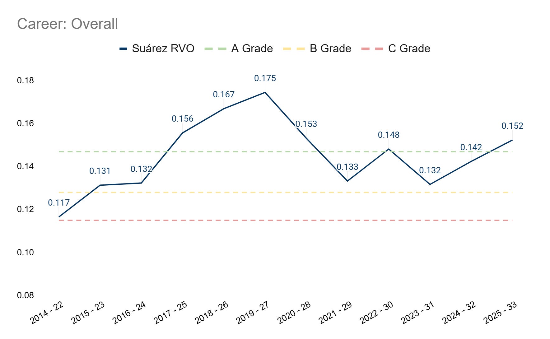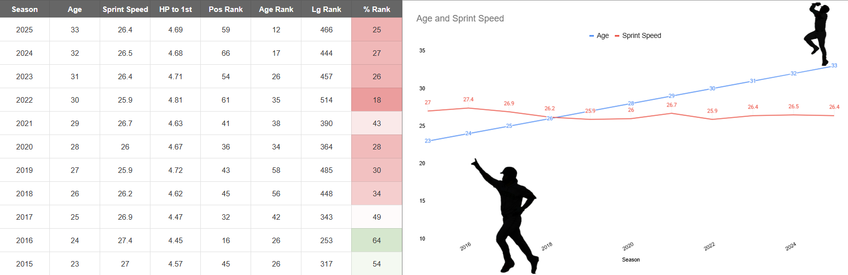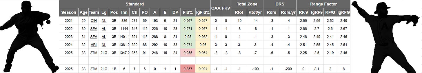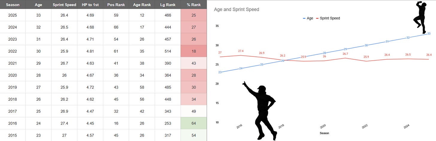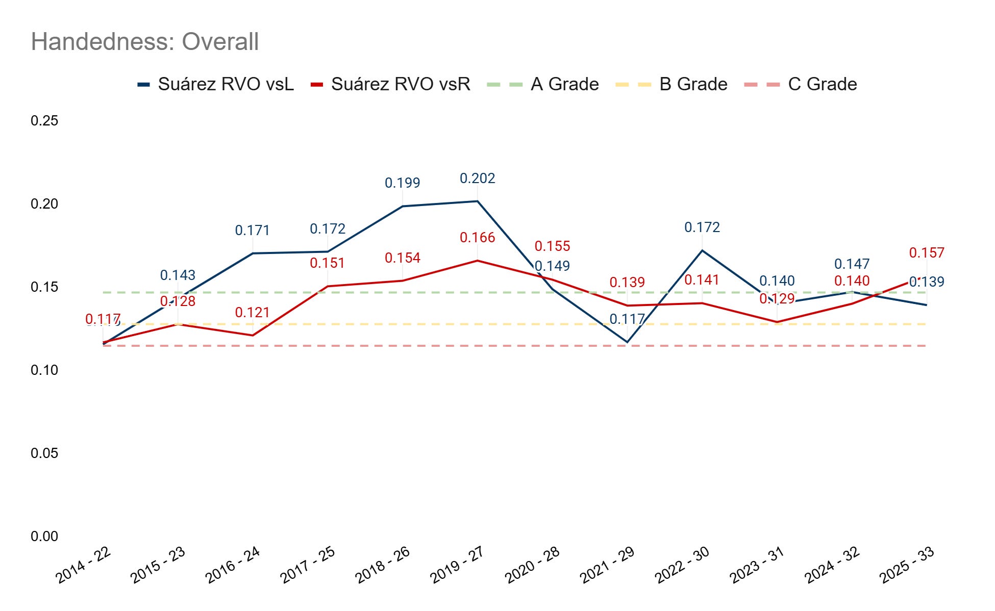 From a Overall production basis, he checks out and has shown the ability to adjust and sustain production later in his career despite not utilizing his Run Tool. This is a professional hitter, with a proven track record to make adjustments and knows himself. I am confident in Suárez’s Production, Bat and his ability to make adjustments. Despite turning 34 in July, I do not foresee a major drop in production in 2026 without a material change occurring.