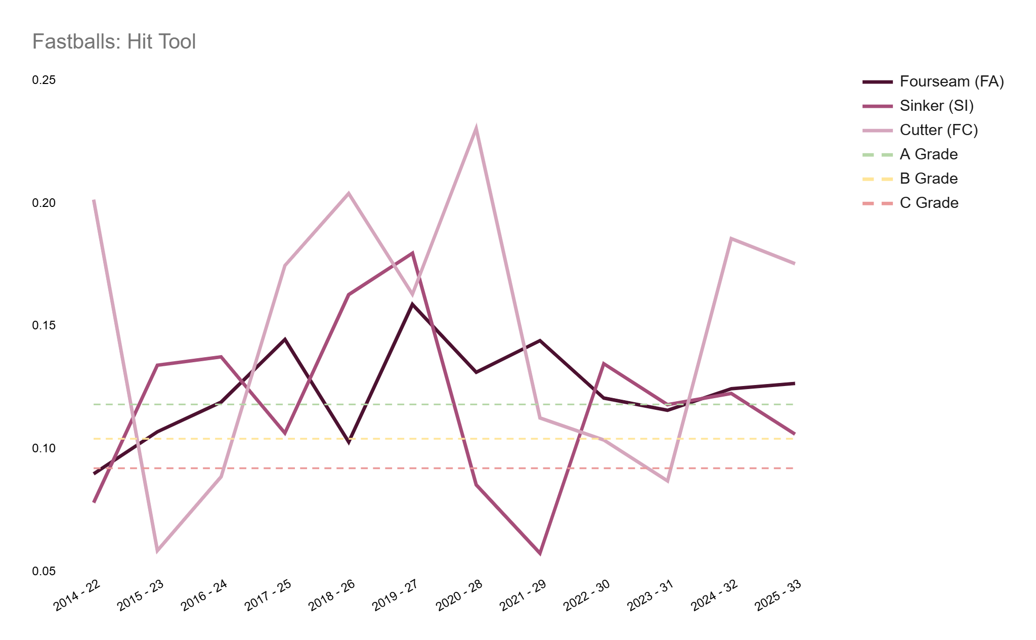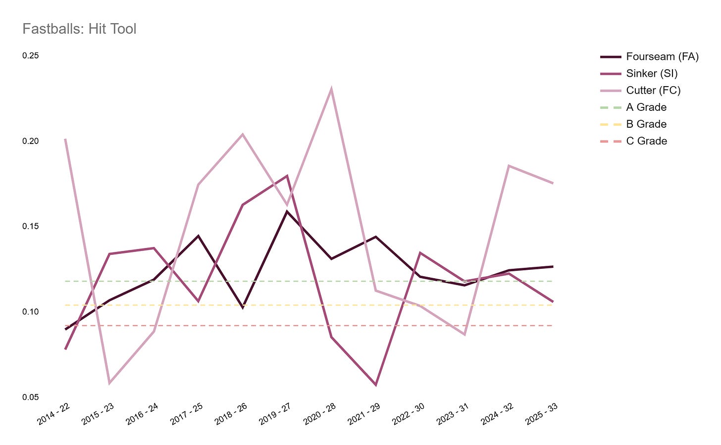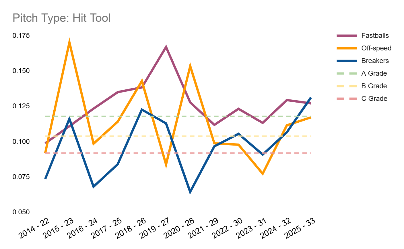 A lot of his rate in 2025 came from his production off RHP. Over his career he’s generally been a B-Grade or better both LHP & RHP. To dive deeper into the Hit Tool a lot of the underlying metrics hold up well, as well. The best example of this has been his production against various pitch types throughout his career. Typically one of the first things to go in older player is their ability to hit off the fastball.