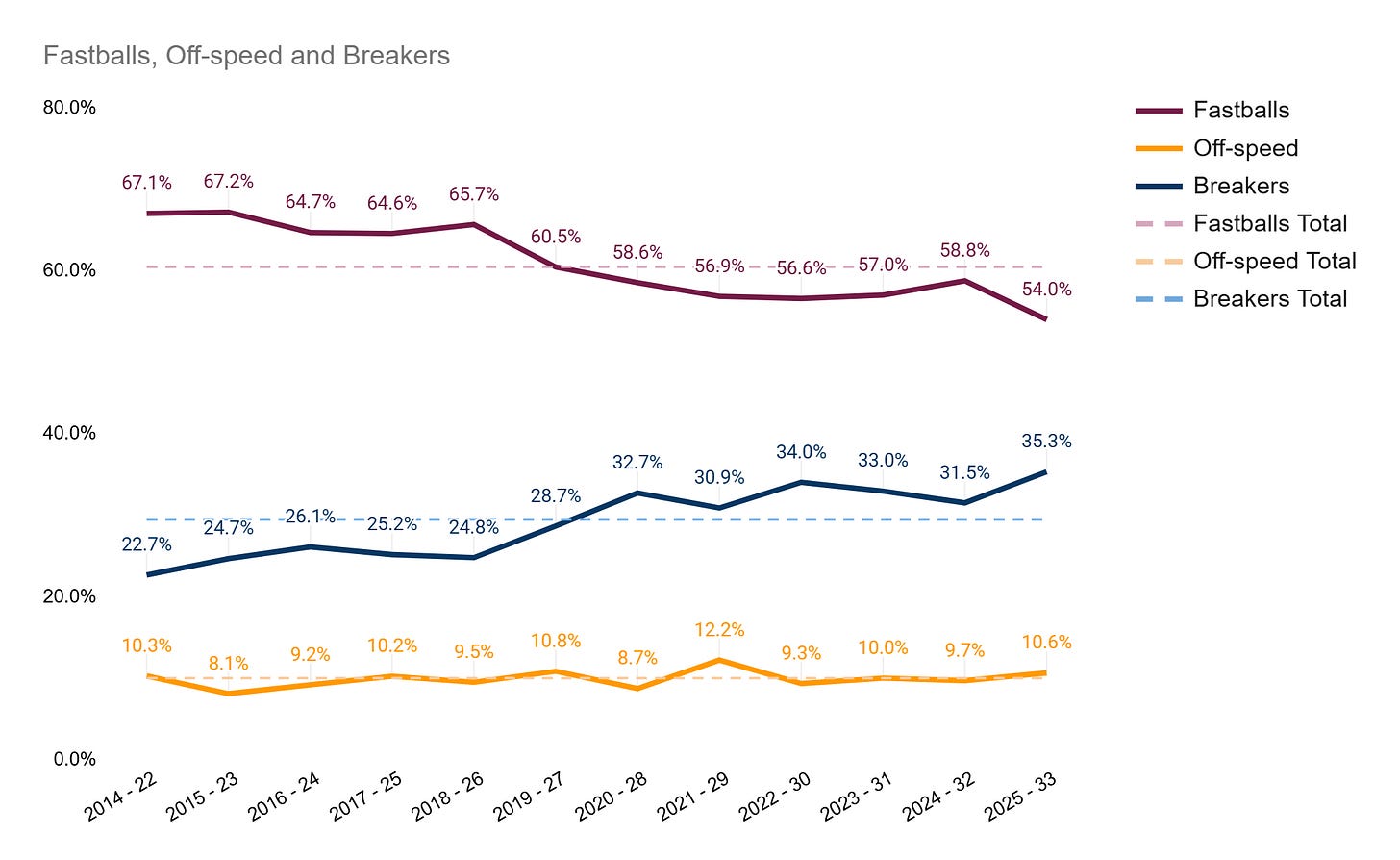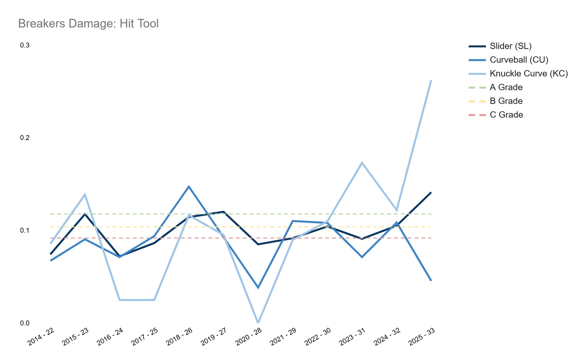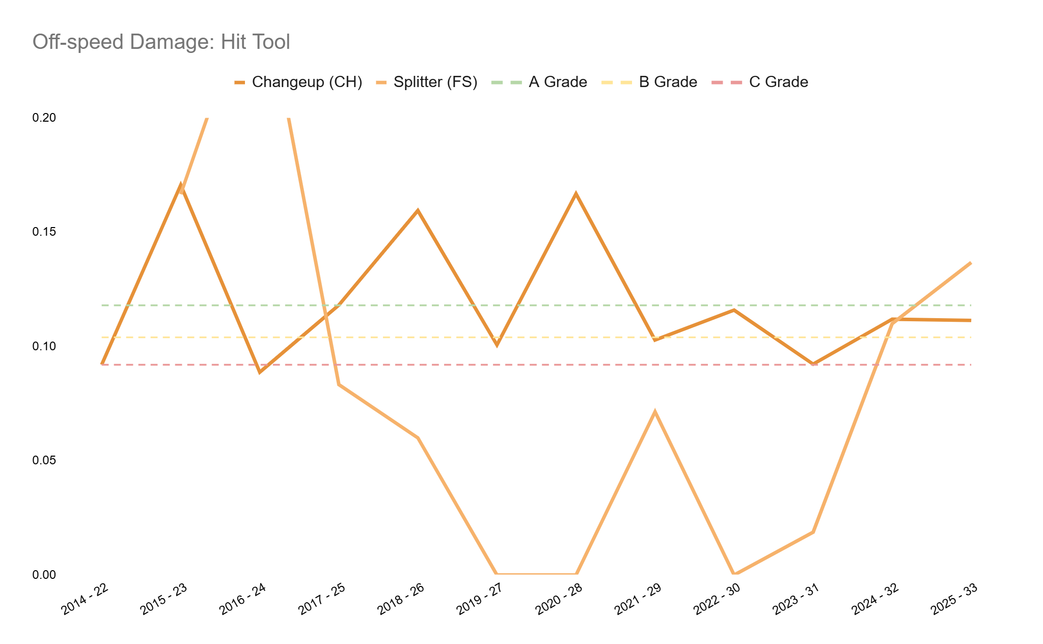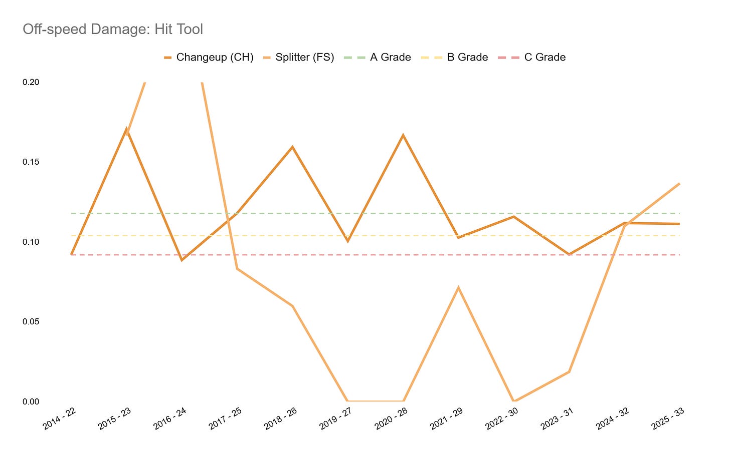 A lot of his rate in 2025 came from his production off RHP. Over his career he’s generally been a B-Grade or better both LHP & RHP. To dive deeper into the Hit Tool a lot of the underlying metrics hold up well, as well. The best example of this has been his production against various pitch types throughout his career. Typically one of the first things to go in older player is their ability to hit off the fastball.