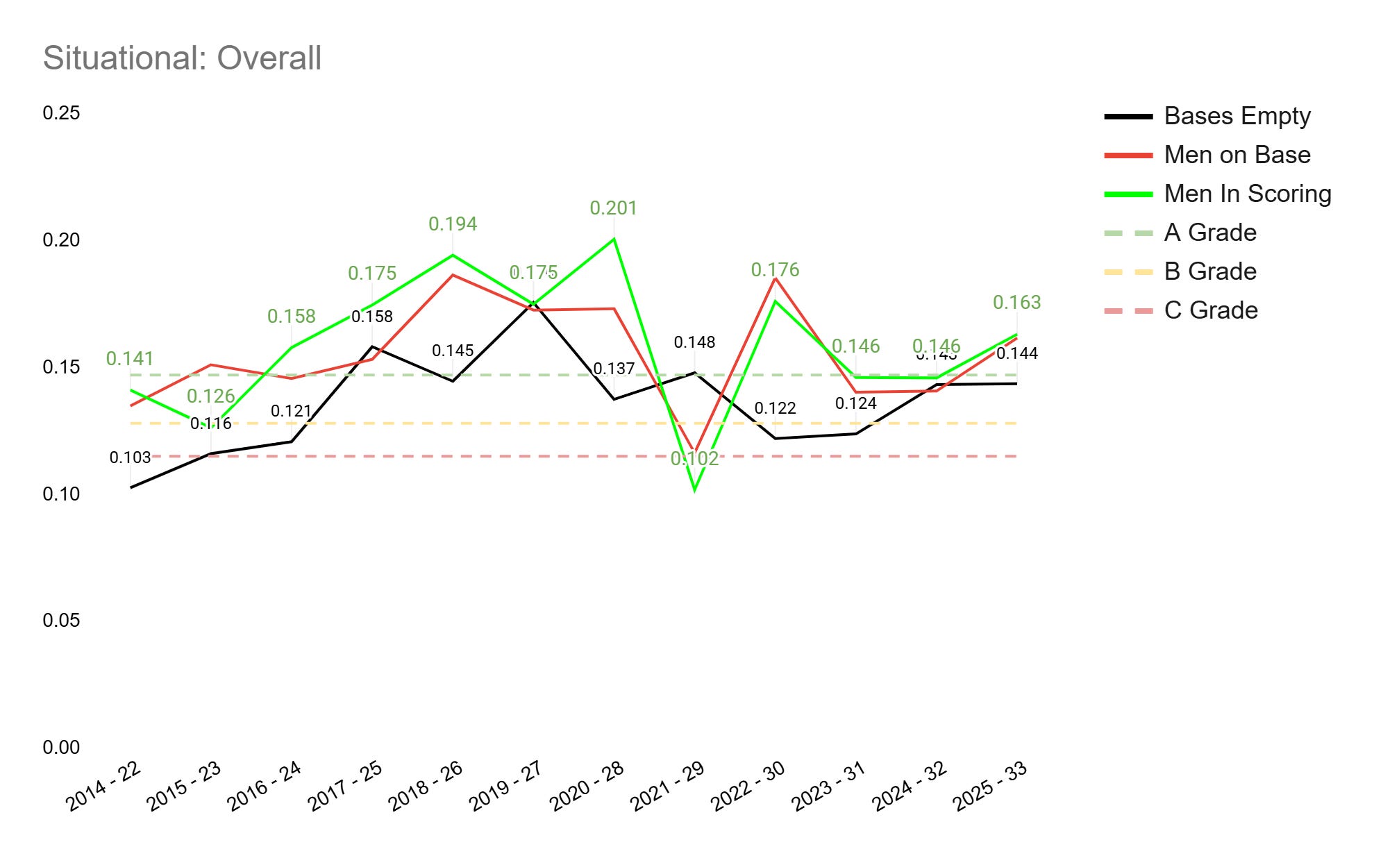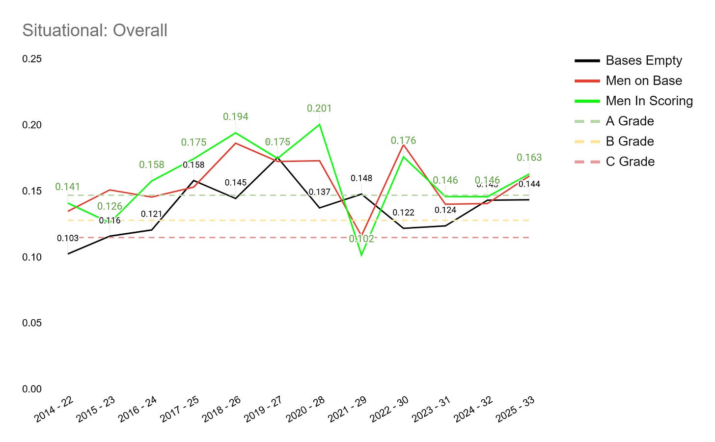 Situational - A still a wide lens, splitting totals into Bases Empty/ Men on Base/ Men in Scoring. This provides a valuable look into possible larger trends in particular situations. I believe Bases Empty/ Men on Base/ Men in Scoring are beneficial stats.