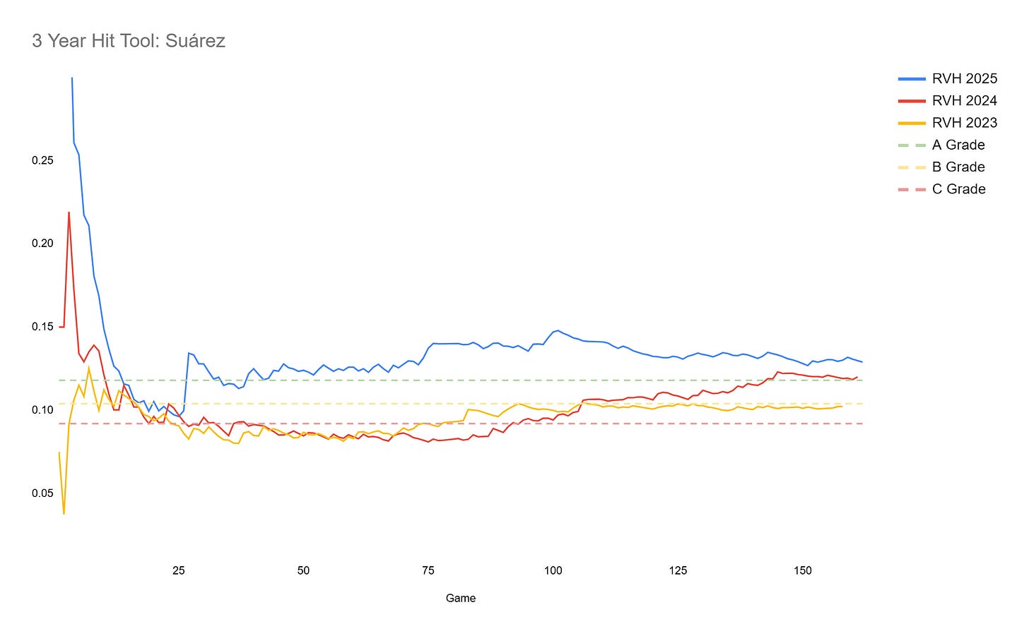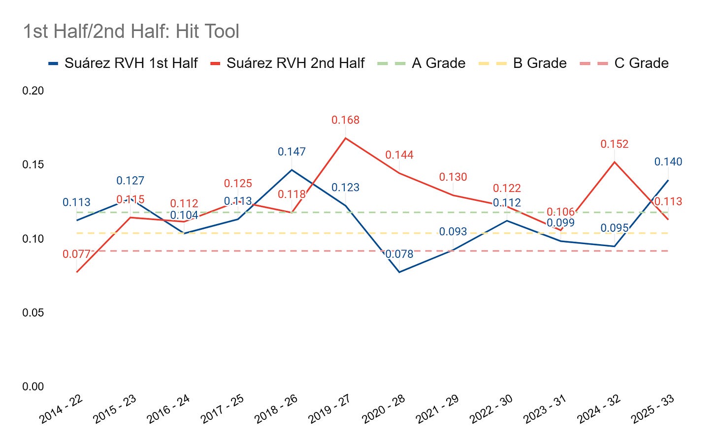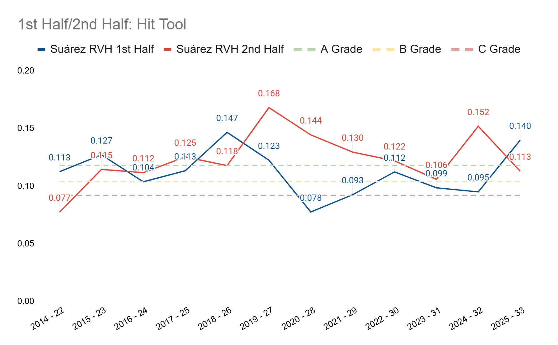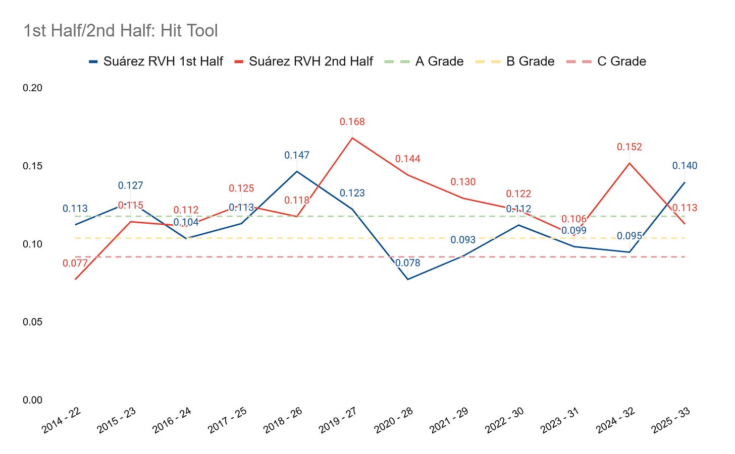 Suárez’s Hit Tool has been above B Grade to Elite-Elite through out his career. The five years from 2020 to 2024 Suárez’s 1st Half Hit Tool has been average to below average. Going into 2025, one of my biggest concerns would have been his slow starts in 2023 and 2024 are not trending too great. You have to think at some point the slow start may just become the player he will be. In 2025 Suárez bucked that trend pretty hard.