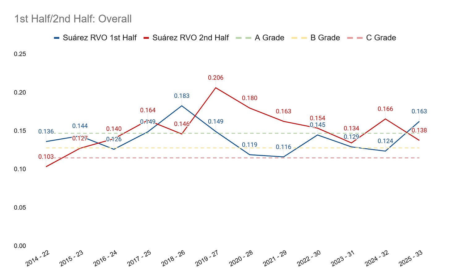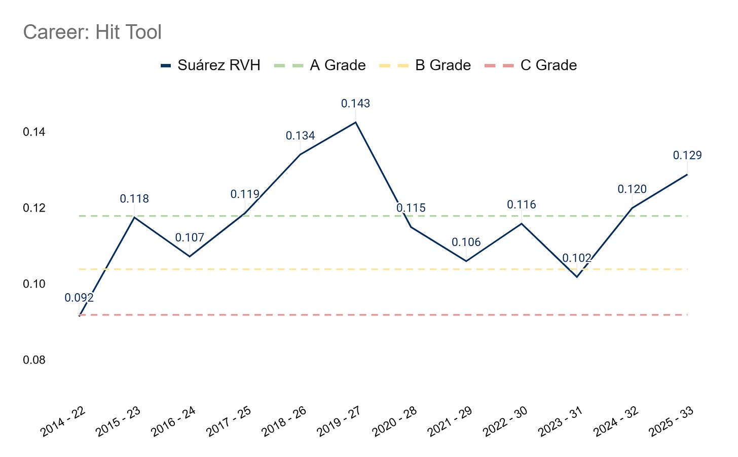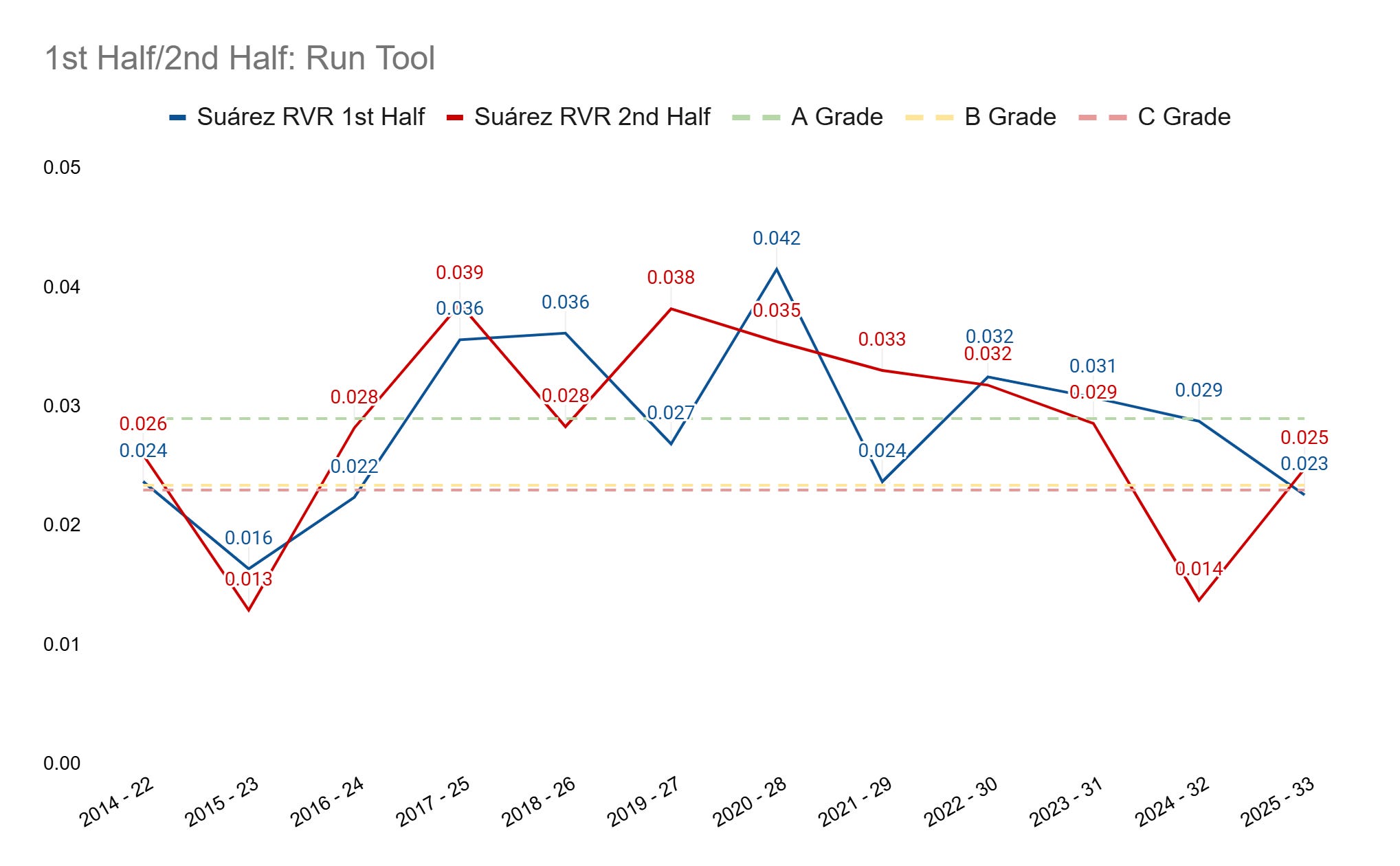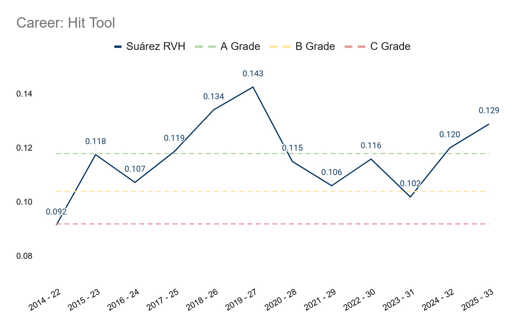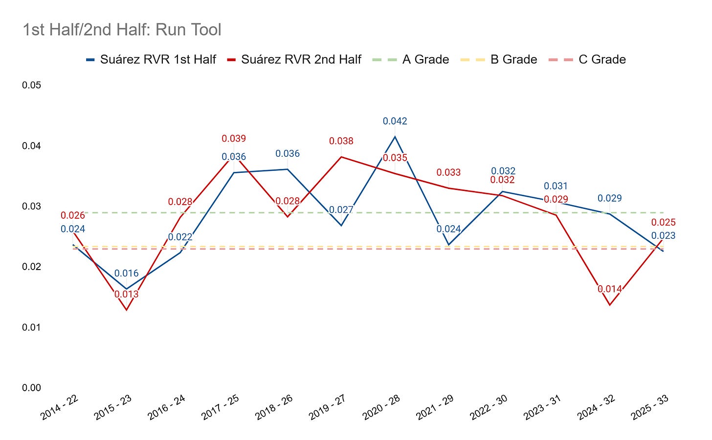 Suárez’s Hit Tool has been above B Grade to Elite-Elite through out his career. The five years from 2020 to 2024 Suárez’s 1st Half Hit Tool has been average to below average. Going into 2025, one of my biggest concerns would have been his slow starts in 2023 and 2024 are not trending too great. You have to think at some point the slow start may just become the player he will be. In 2025 Suárez bucked that trend pretty hard.