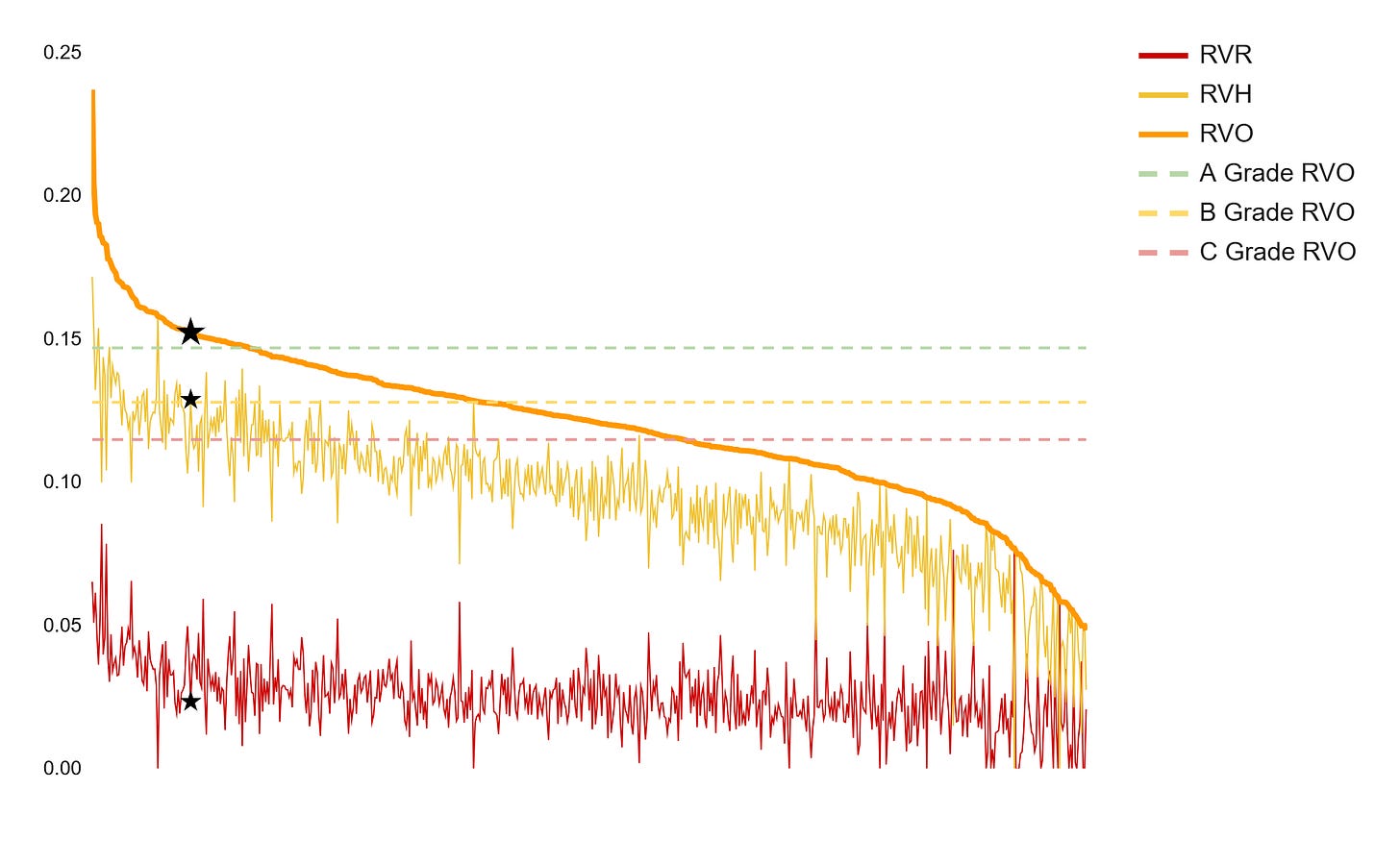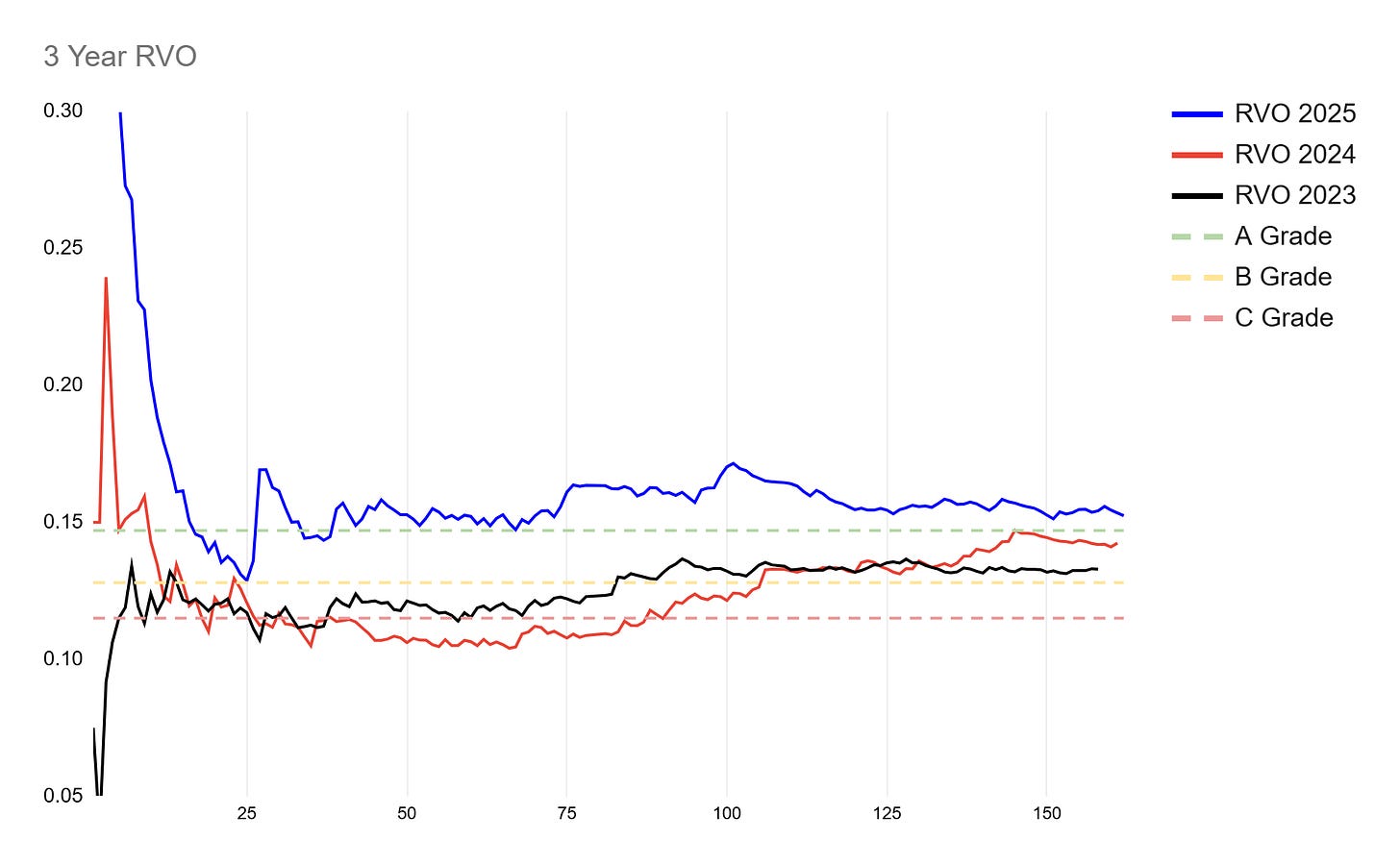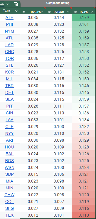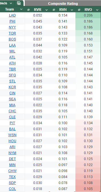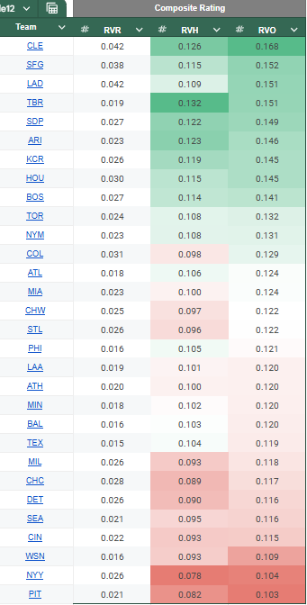 RVO (Run Value Overall) “Overall” — The sum of Run Tool + Hit Tool, representing overall offensive contribution per plate appearance
