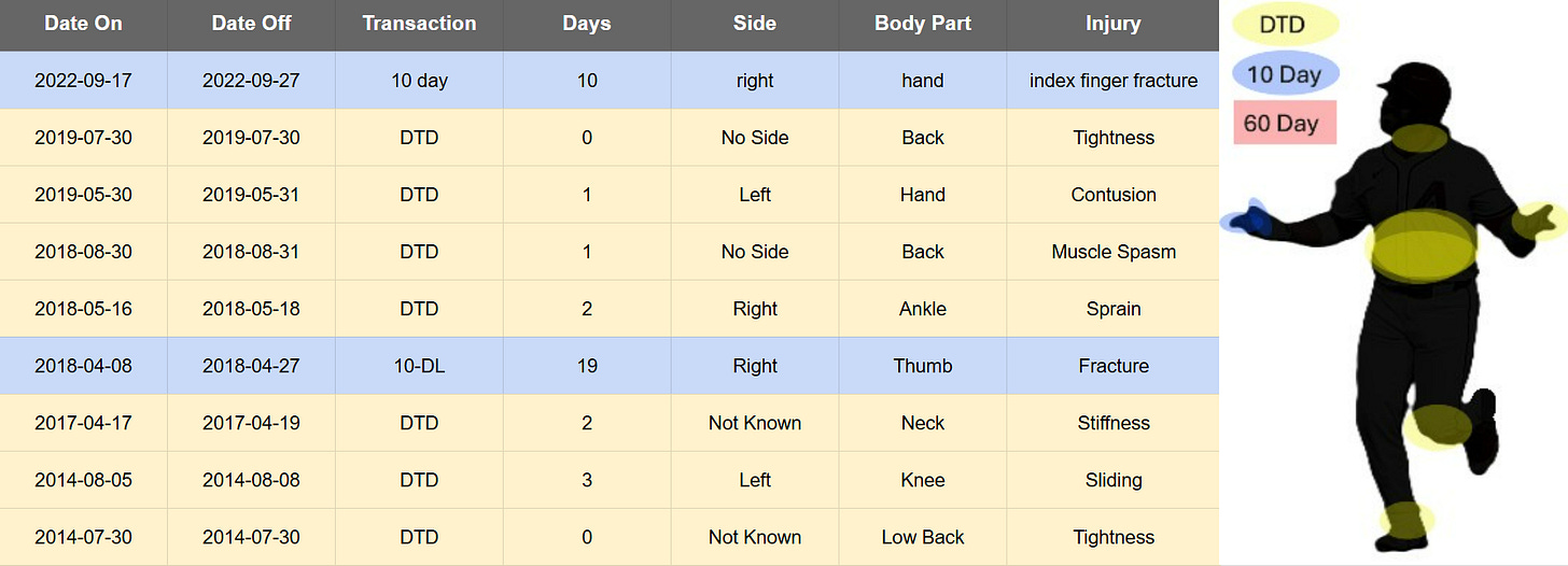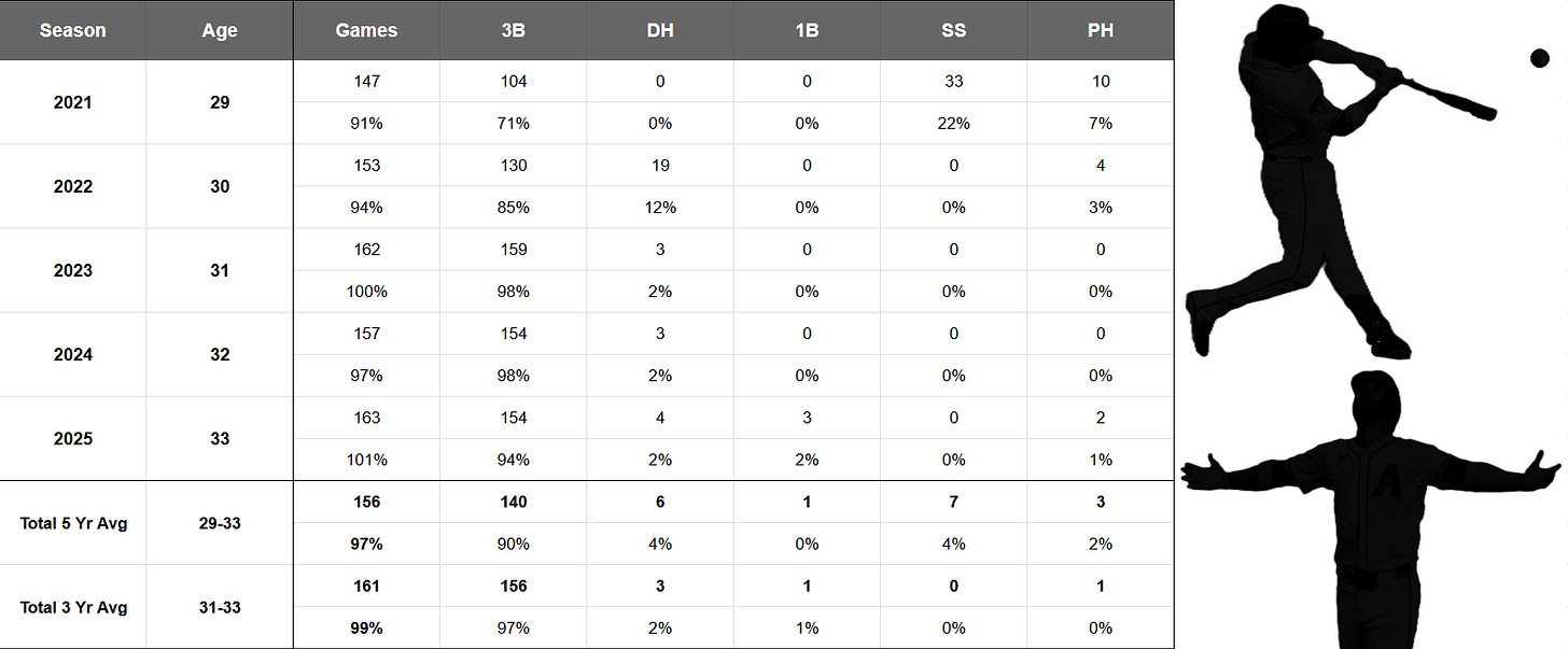 Suárez has a minimal injury history and posts everyday, over 97% games played the past 3 years. A large majority of those games coming at 3B. He’s been a reliable glove over at 3B until this past year where his fielding percentage fell below league average. His range took a bit of a dip as well. Years at 3B could be limited, but worth checking with R&D on positioning options/limitations. This could be a 3B/1B/DH play beyond 1 year.