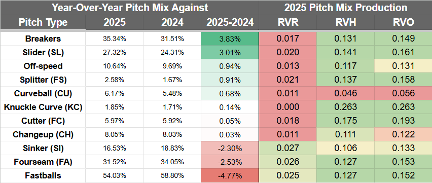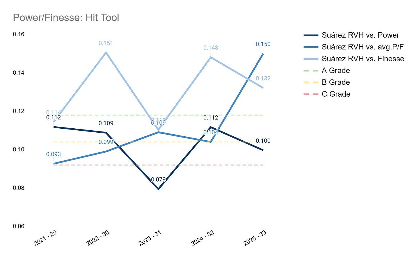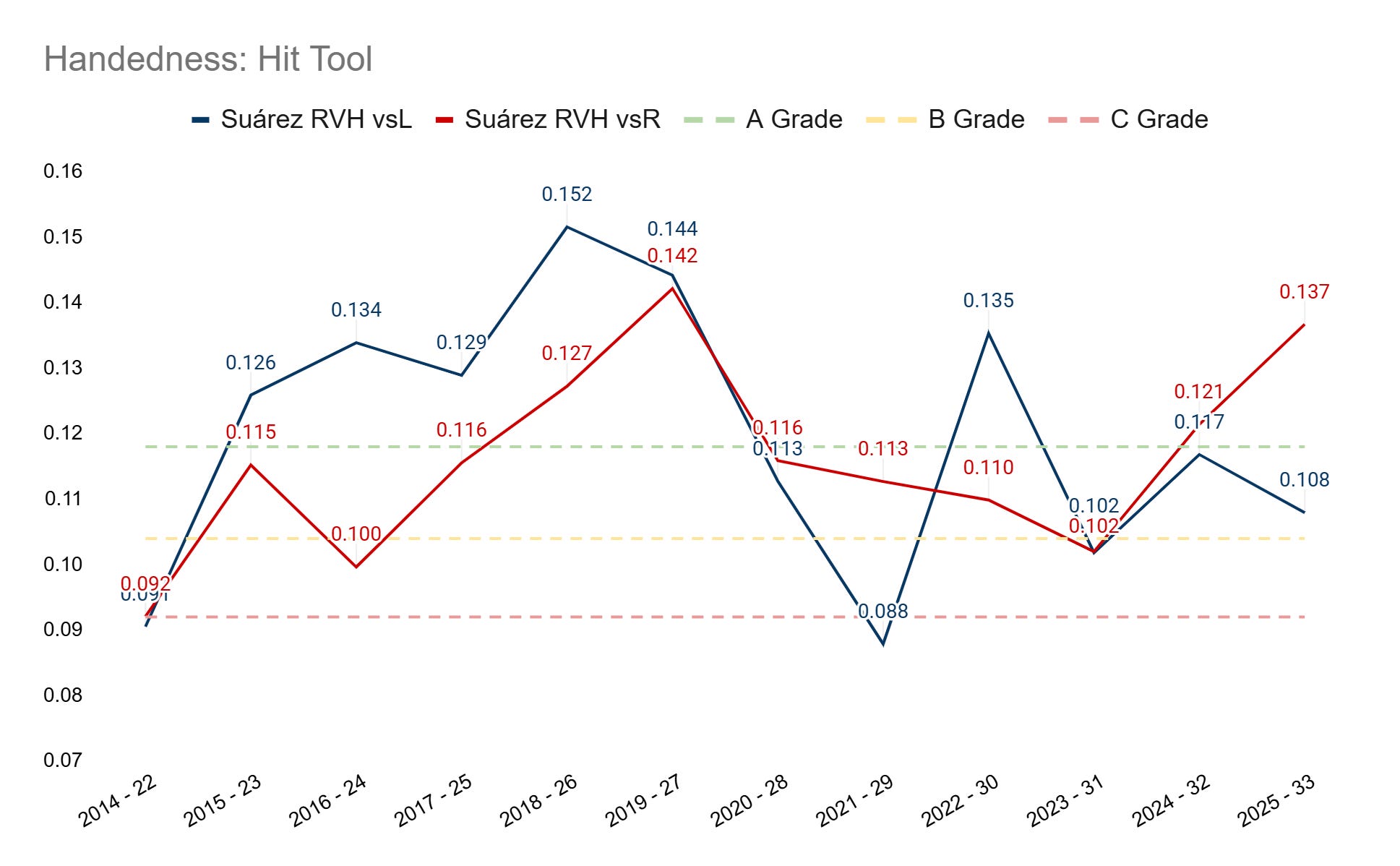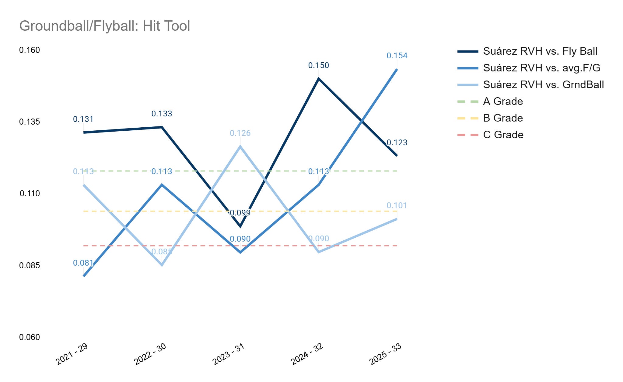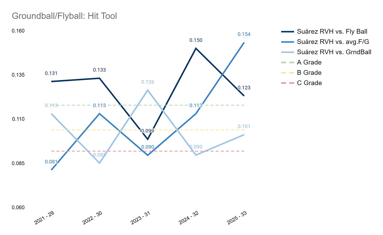 From 2020-2024 his Hit Tool against Sliders has been B-C Grade. I think this usage trend will shift away from sliders in 2026 (possibly to curveballs), because in 2025 Suárez Hit Tool was Elite against Sliders. Another sign of Suárez’s ability to make adjustments, being a professional. Moving forward, the pitch of 2025 was the splitter, and that won’t be an issue for Suárez, great production.
