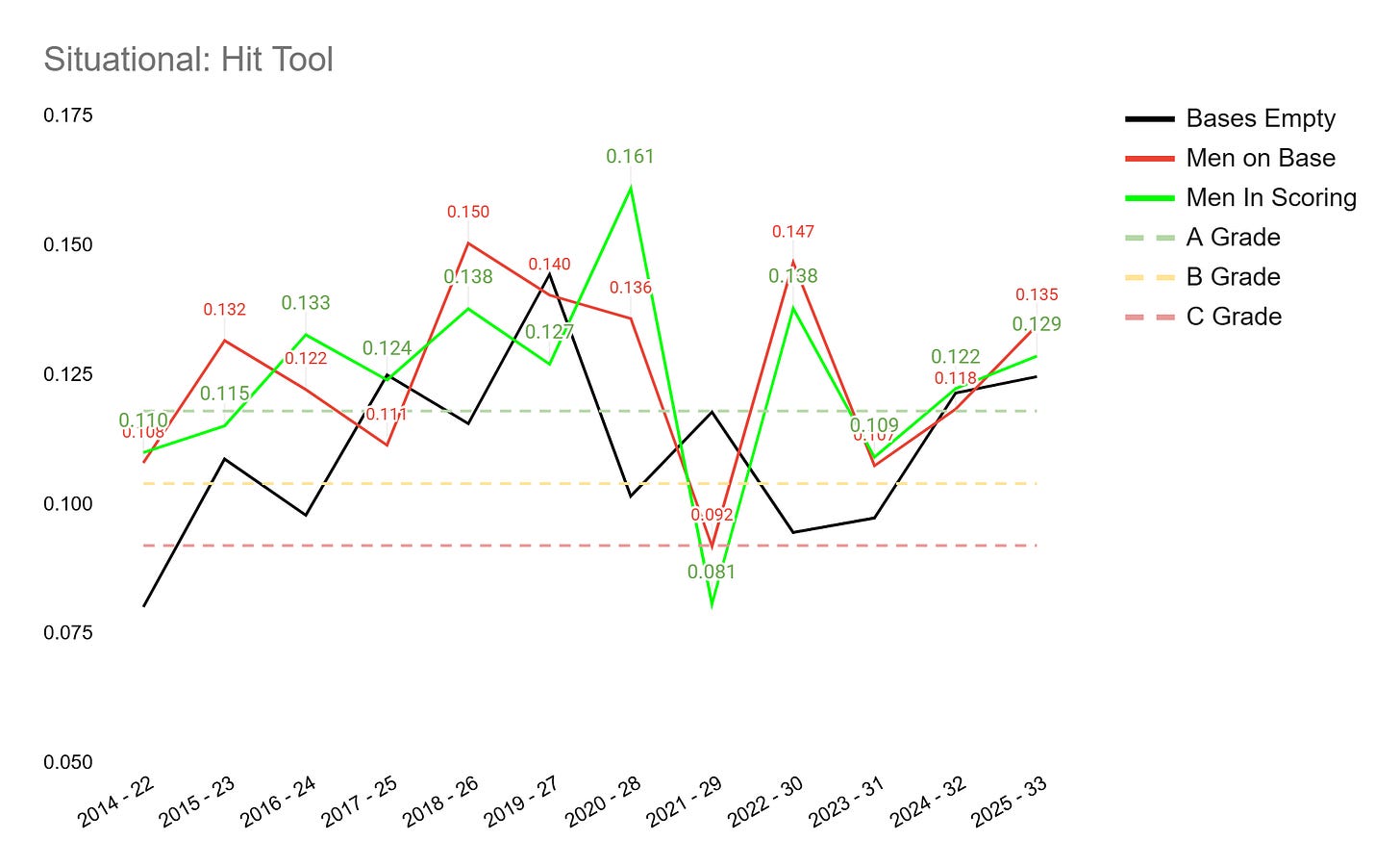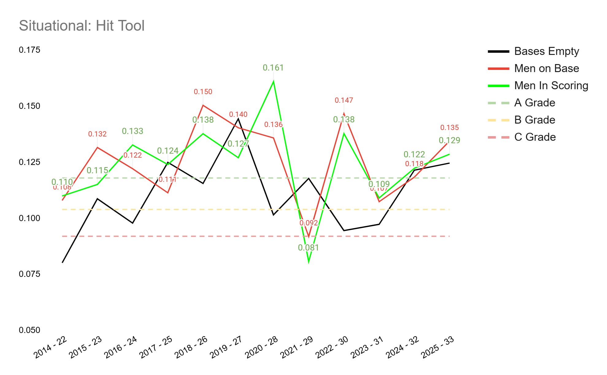 His Run Tool production has been slowly declining since a peak in 2020 at age 28, and is steading in the C Grade range. The primary Run Tool driver are his LHP & RHP Splits. If his Run Tool is not going to help sustain his production, I look to his Hit Tool …