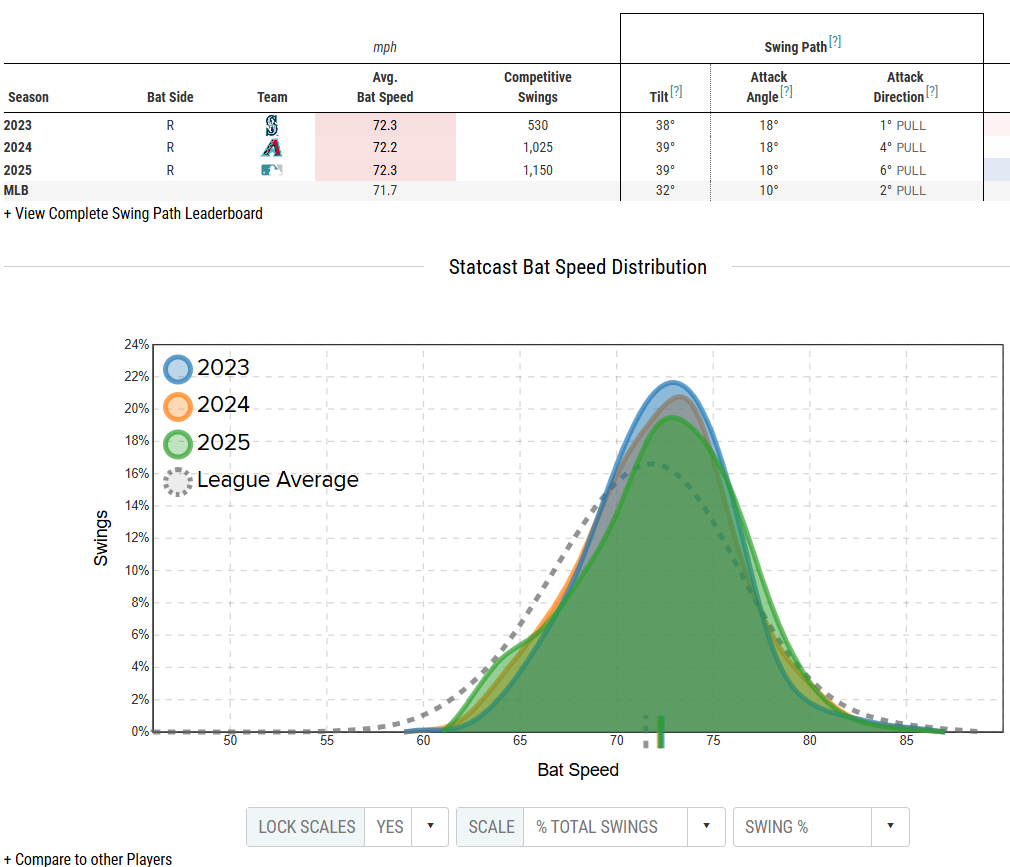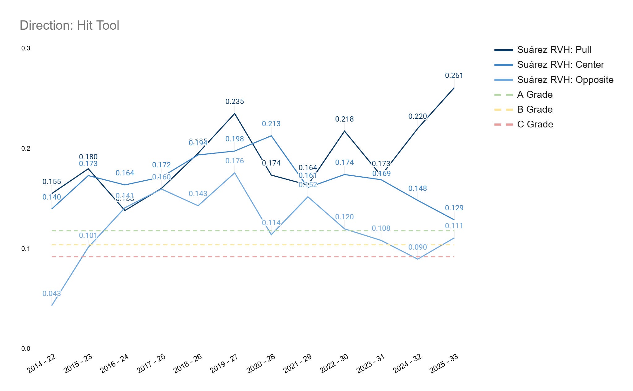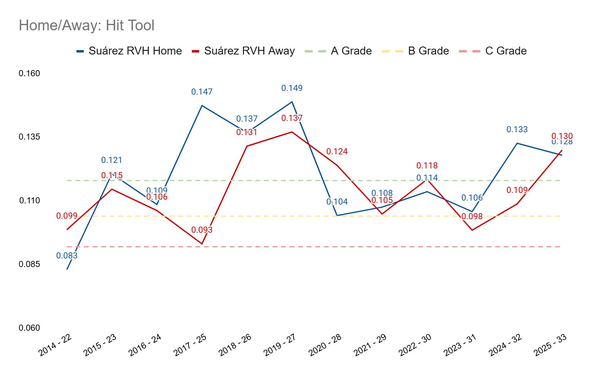 In 2025 Suárez’s Hit Tool was A Grade pretty much start to finish. There was a bit of a fall off with the Hit Tool in the 2nd Half in 2025, but it’s tough to tell how much of that had to do with playing in Seattle. It’s not a great place to hit between the angle/light of the batter’s eye.