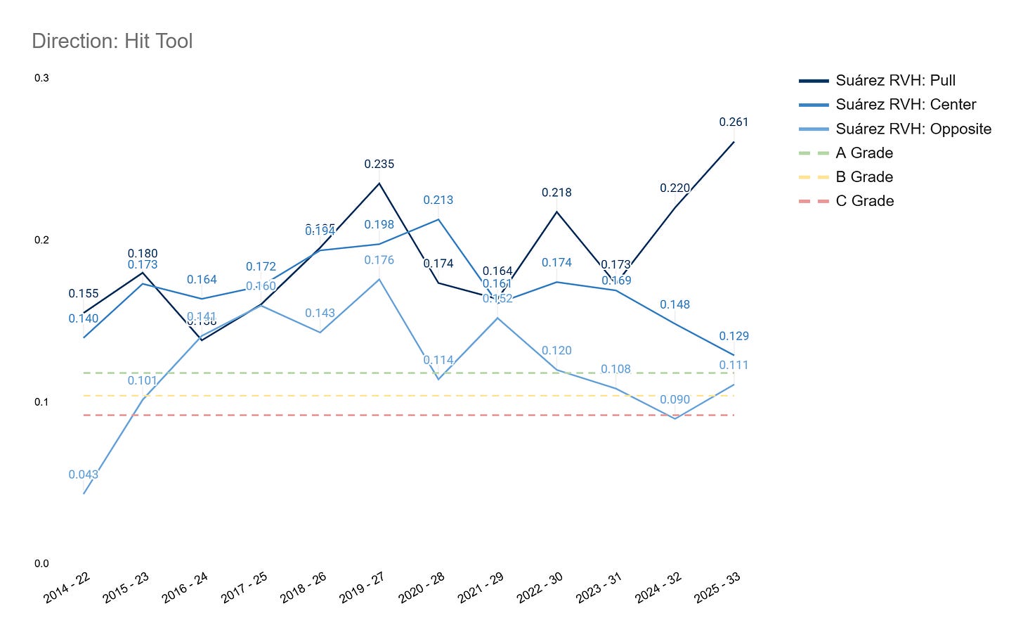 I am not a fan of the age, steadily decreasing production to CF/RF, dip in fielding % in 2025. I am a fan of his ability/desire to post everyday (3-Year 97%), ability to hit the fastball, pull side pop, his overall production and the adjustments he’s able to make with his Hit Tool. I see Suárez as a good fit in a ballpark that can maximize his pull side power.