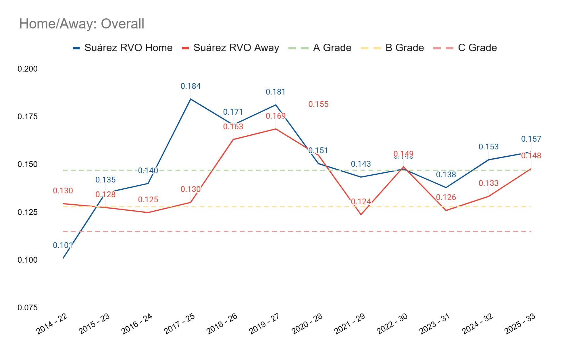 There are plenty of ways to evaluate offensive production. For this review, I’ll measure Eugenio Suárez against his positional peers using an A-B-C grading scale. Specifically, I’ll compare him to the average A Grade (1–10), B Grade (11–20), and C Grade (21–30) player at his position. In Suárez’s case, his positional comp is Third Base (3B).
