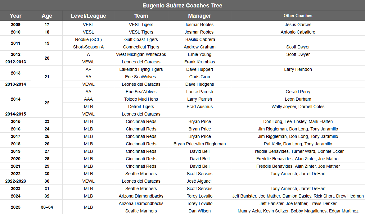 Eugenio Suárez will turn 35 in July, so this will likely be a 1 year deal, max 2 years. 2026 will be his 12th year in MLB and you do not survive 11+ years in MLB without the ability to make adjustments or understand what makes you successful. Regardless of performance, at 34 years old the check engine light automatically comes on to check the serpentine belt and look for rust on the chassis.