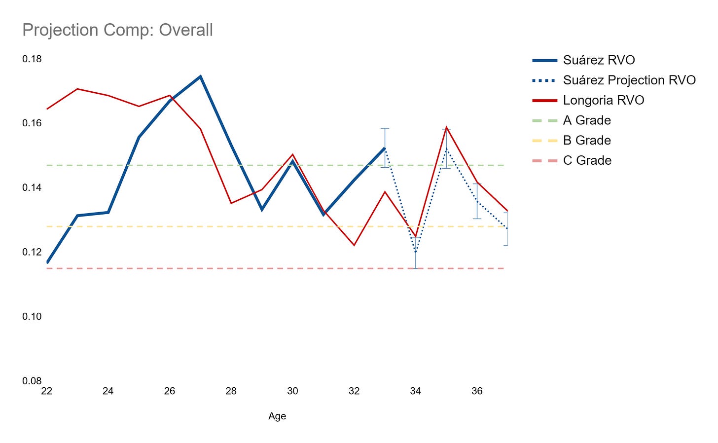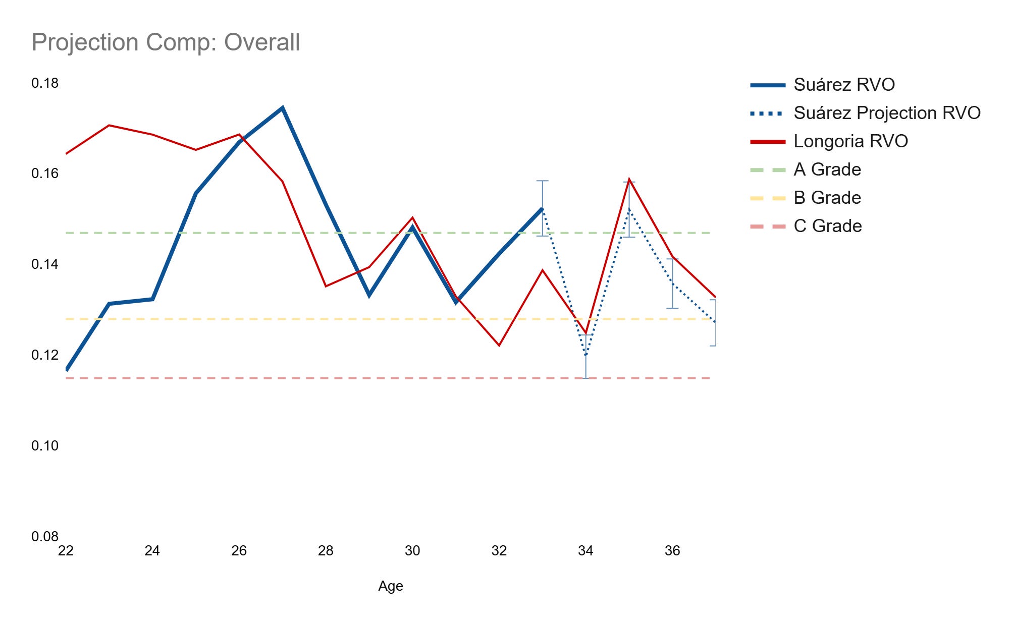 If Suárez follows a Longoria type trajectory, then you are looking at a hitter between B Grade to A Grade for 3B. Longoria games played did take a hit in his age 34 season.
