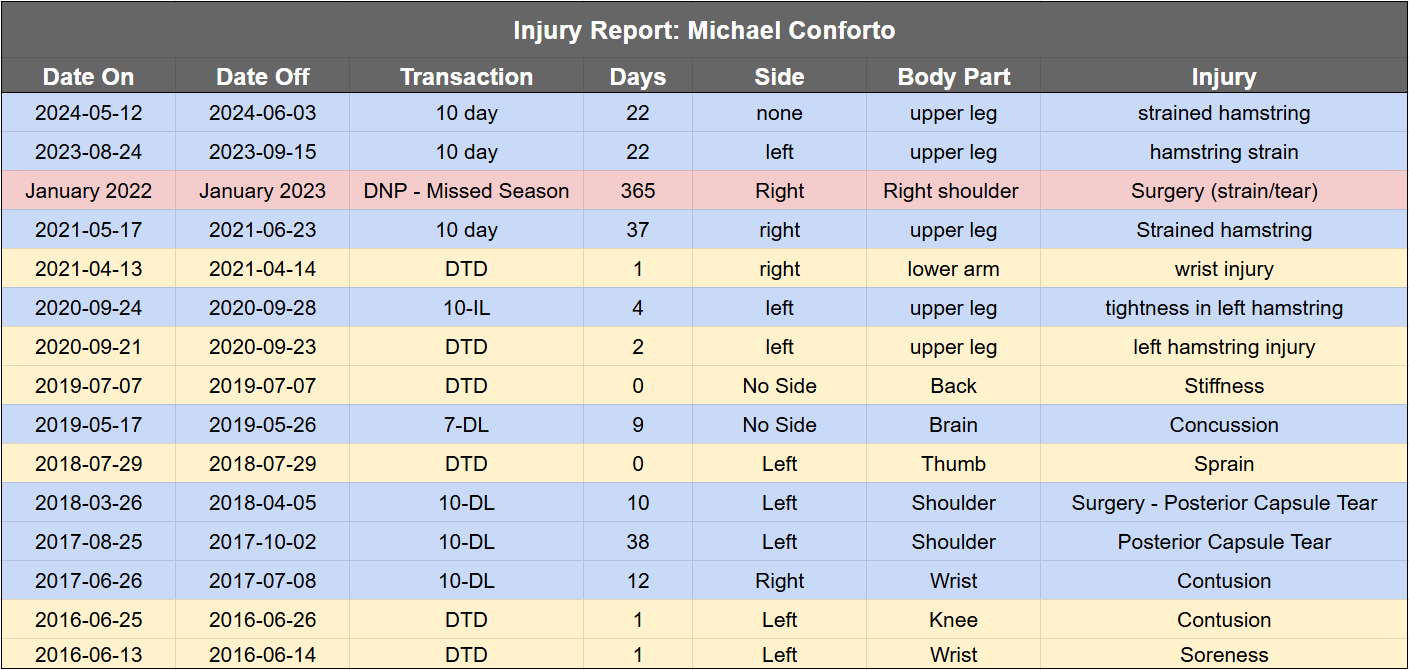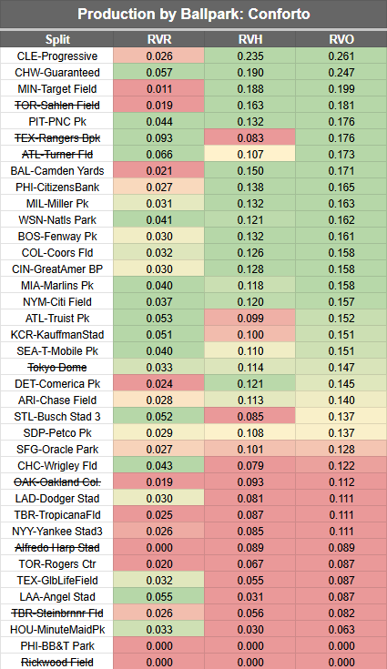 I see this as a buy the dip, low risk opportunity on a veteran, and if he figures it out you could deal him at the deadline or ride it out if you are a contender. If not, you can release him. Team’s with a lower RVO at LF/DH/RF are LF - STL, CHW, KCR DH - CHW, TEX, SDP, COL RF- CIN, SFG, TEX, KCR, SEA, CLE, STL and here’s a list of Conforto’s Production by Ballpark. Also, a team like the Brewers comes to mind as willing to take on guys like Andrew Vaughn.