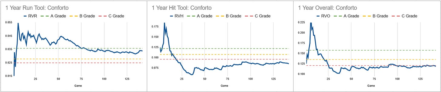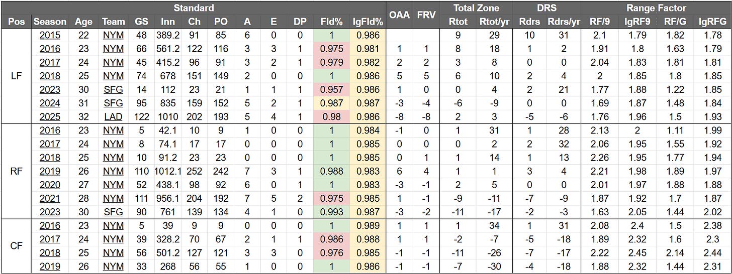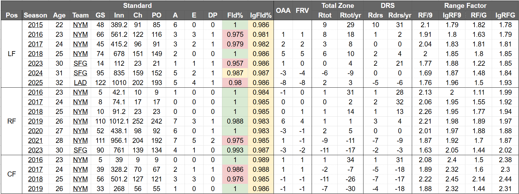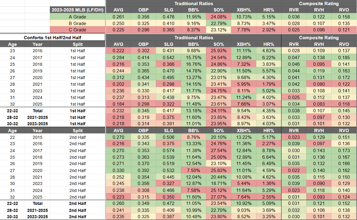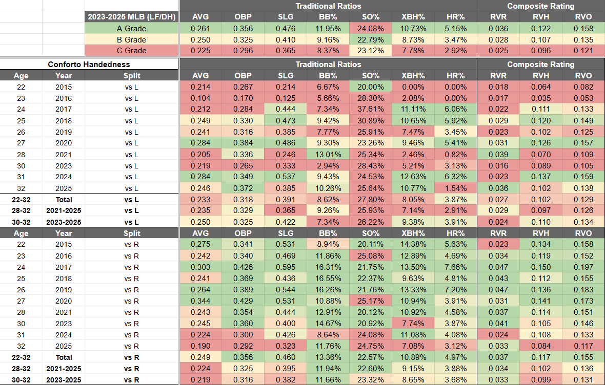 This off-season, Jake Fraley (.134 RVO in 2025) signed for 1yr/$3 mil with the TBR, JJ Bleday (.131 RVO in 2025) signed for 1yr/$1.4mil with CIN. Conforto (.120 RVO in 2025) I would be comfortable at 1yr/$1 mil.