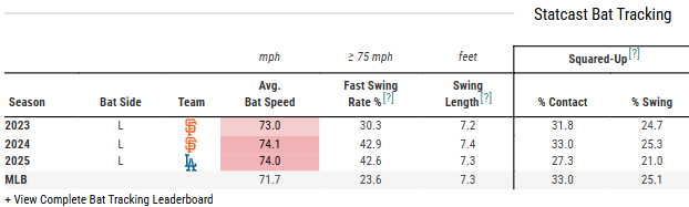 These types of 2 Grade drop offs are typically associated with age/drop in bat speed. On a positive note his bat speed is still there, which make this a little odd.