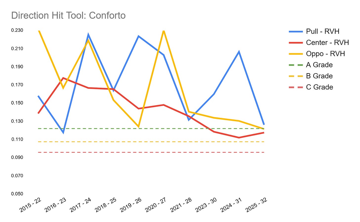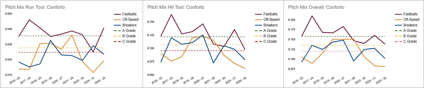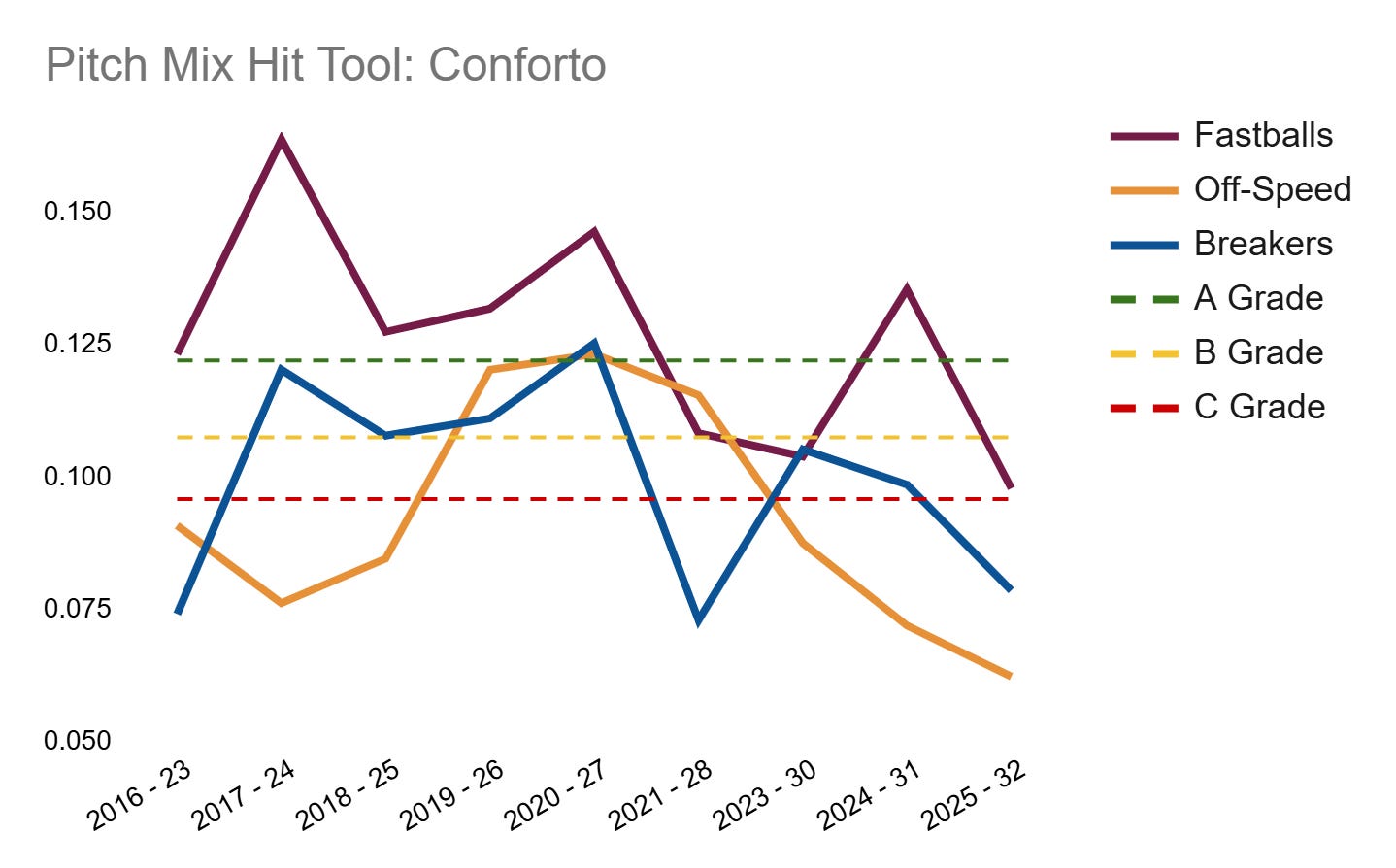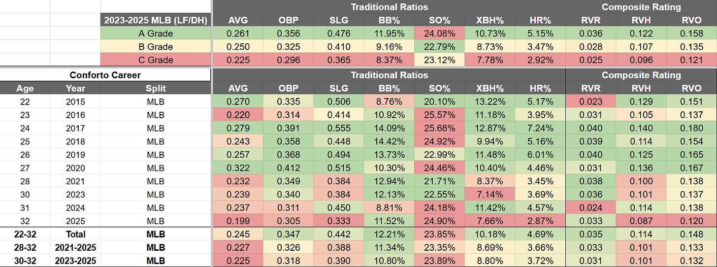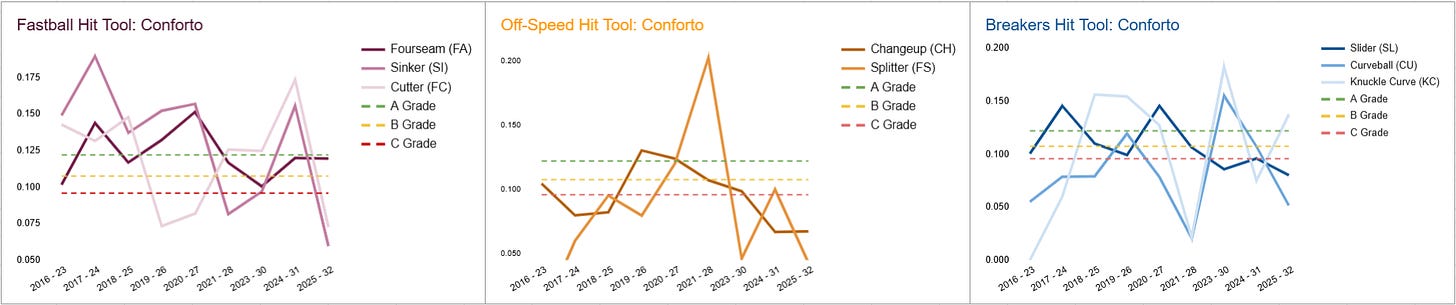 Michael Conforto will be 33 years old for the 2026 season and it will be his 10th MLB season. This will likely be a 1-year contract. Over the past two seasons he is slightly below a B-Grade Offensive LF/DH. Over the past year he’s be a C-Grade Offensive LF/DH. There are a lot of concerns looking at the numbers, multi Grade drops in all Hit Tool categories: Career Hit Tool, Handedness Hit Tool, Pull Side Production, Pitch Mix and Fastball.