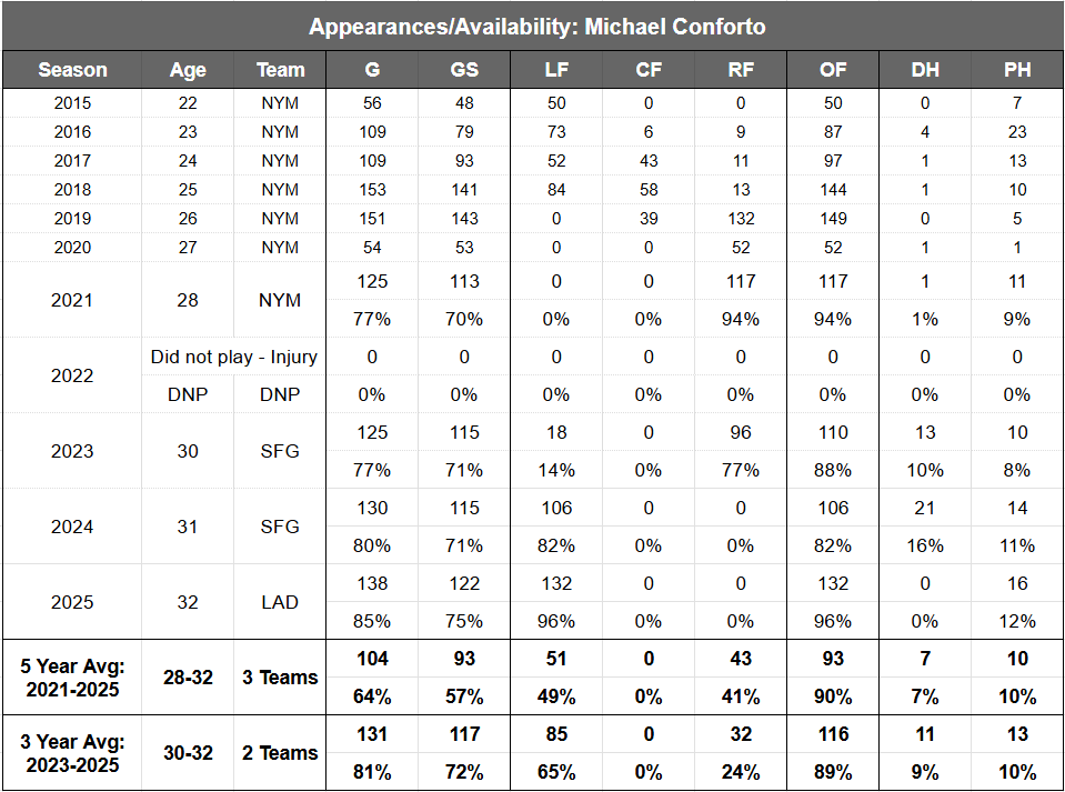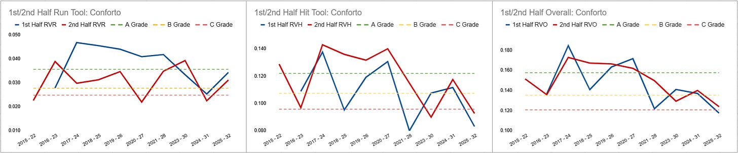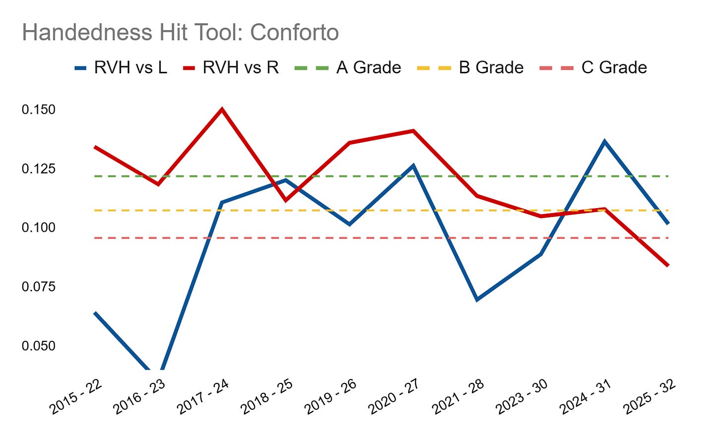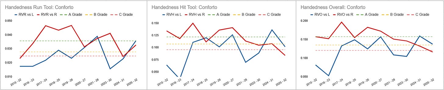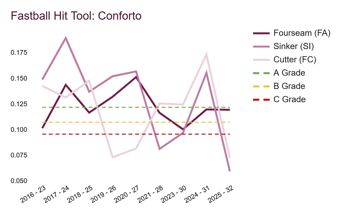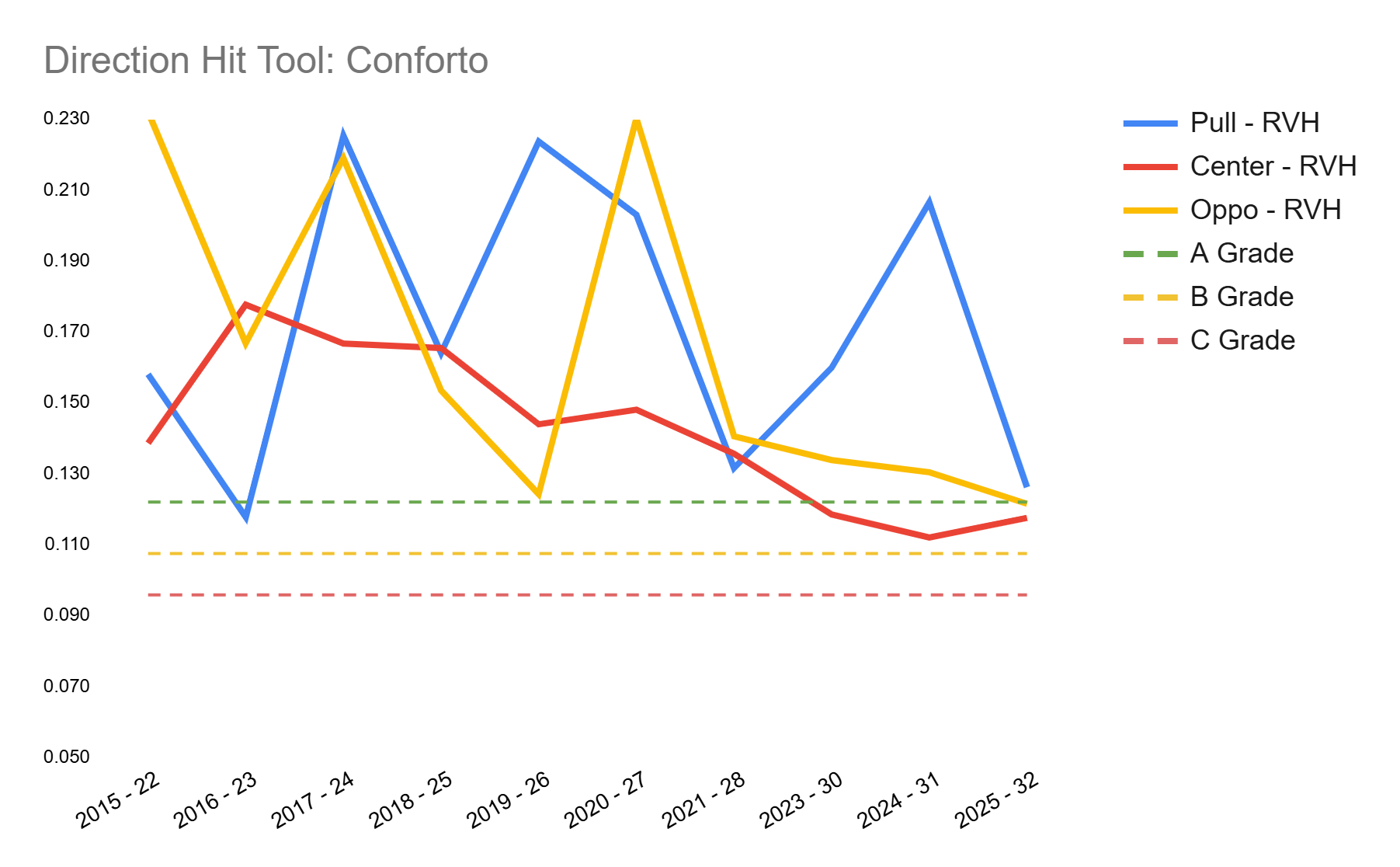 Michael Conforto will be 33 years old for the 2026 season and it will be his 10th MLB season. This will likely be a 1-year contract. Over the past two seasons he is slightly below a B-Grade Offensive LF/DH. Over the past year he’s be a C-Grade Offensive LF/DH. There are a lot of concerns looking at the numbers, multi Grade drops in all Hit Tool categories: Career Hit Tool, Handedness Hit Tool, Pull Side Production, Pitch Mix and Fastball.