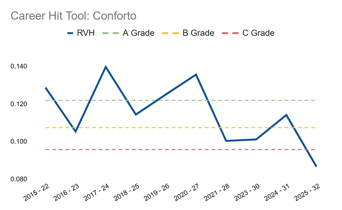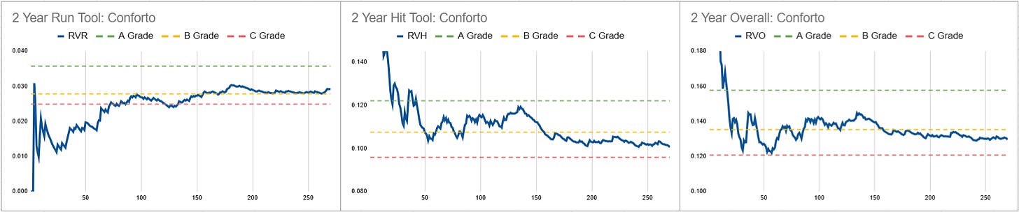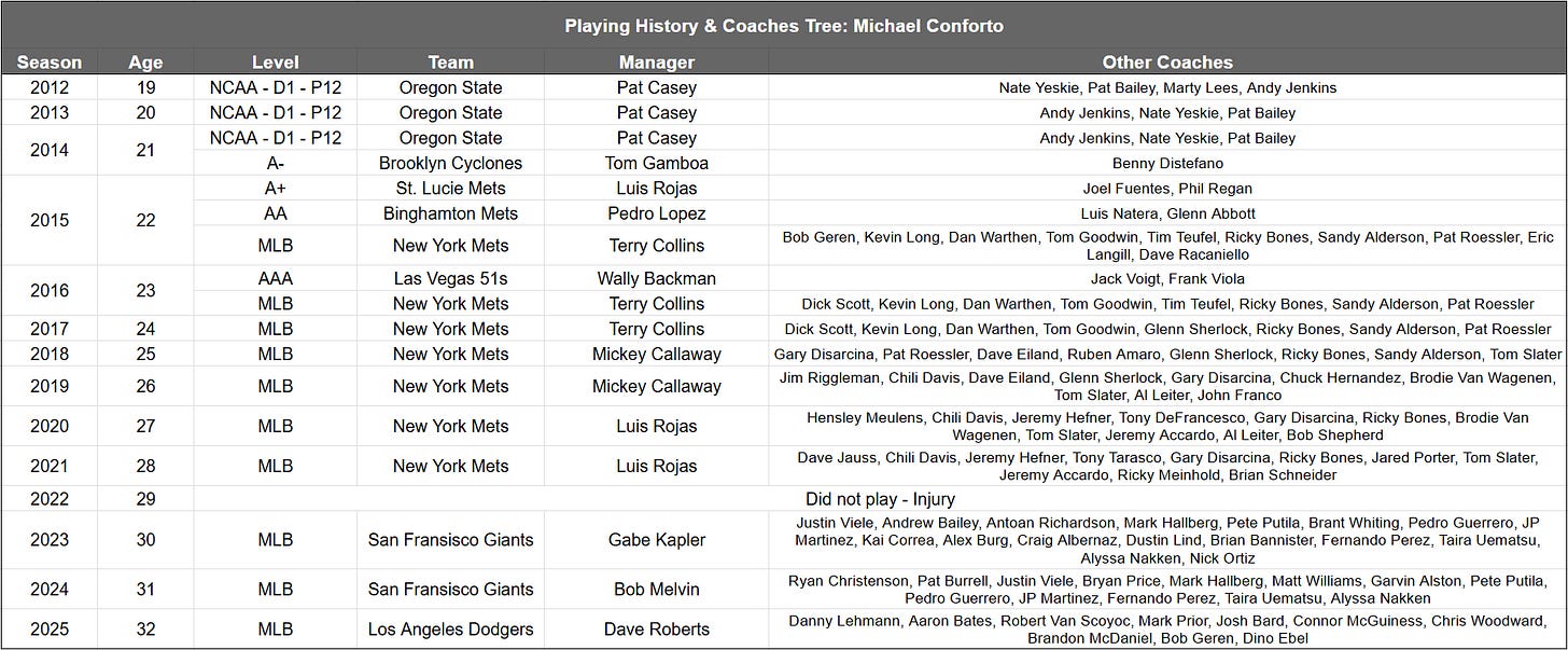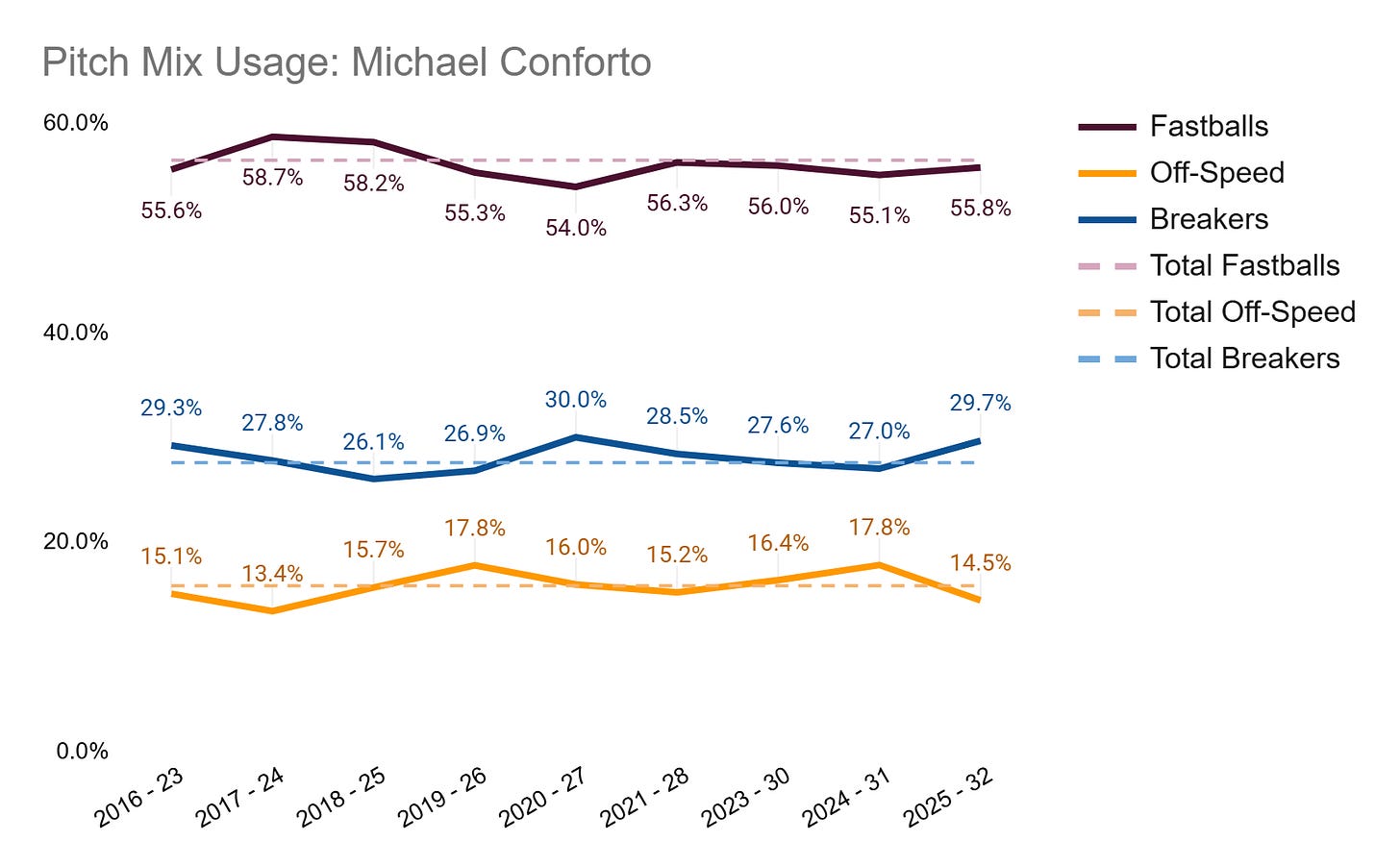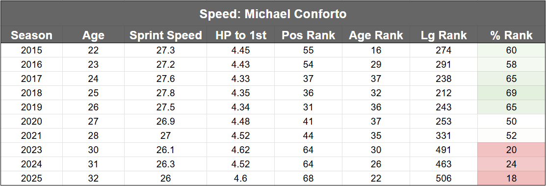 Michael Conforto will be 33 years old for the 2026 season and it will be his 10th MLB season. This will likely be a 1-year contract. Over the past two seasons he is slightly below a B-Grade Offensive LF/DH. Over the past year he’s be a C-Grade Offensive LF/DH. There are a lot of concerns looking at the numbers, multi Grade drops in all Hit Tool categories: Career Hit Tool, Handedness Hit Tool, Pull Side Production, Pitch Mix and Fastball.