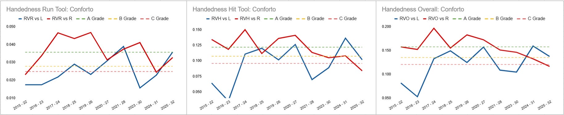 Handedness - vs. RHP & LHP - Still a wide lens, but splitting the totals by LHP & RHP. This provides a valuable look into possible larger trends against left handed and right handed pitchers. One of my favorite splits to look at. This was a pivotal split last year when evaluating Tyler O’Neill. Helpful in 2026 Luis Arráez Eval