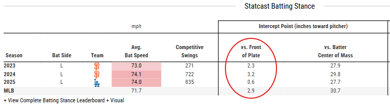 When looking at the data to find a reason for the drop offs I noticed he was making contact a lot deeper than usual which would definitely explain the fall off in production to the pull side.