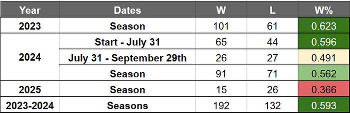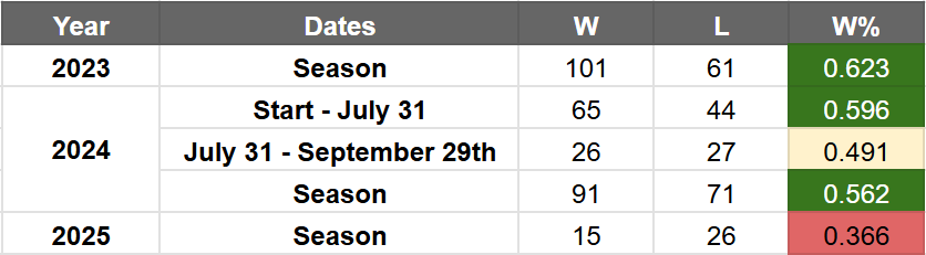 The pitching staff’s fragility was exposed further by MLB’s recent decision to shrink the umpire buffer zone—a change that demands more precision from starters. If the Orioles knew about this shift entering the offseason, their failure to pursue a frontline starter or bolster an already shaky bullpen (bottom-third ERA in 2024, with a closer returning from Tommy John) is puzzling. Teams like the Tigers and Brewers leaned into “pitching chaos” last year to shorten games. The Orioles, with starters unable to go deep, needed that flexibility—or at least a surplus of arms to flip at the deadline. Instead, they entered 2025 unprepared with predictable free agent signings.