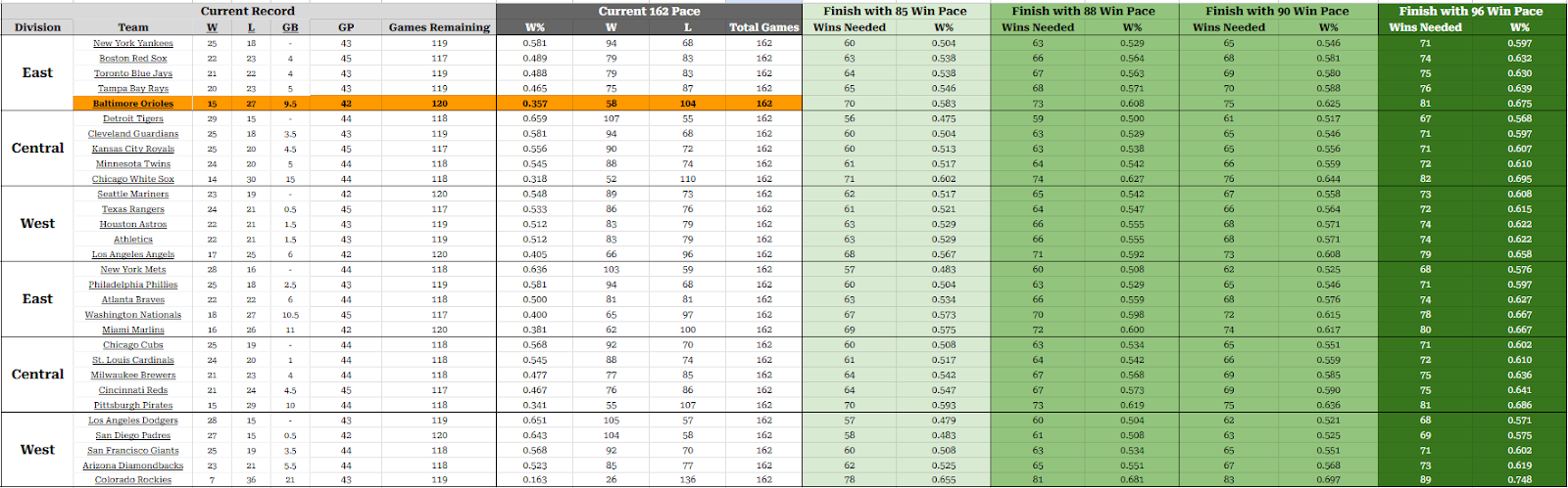 At 15–27, the Orioles would need to play .608 baseball to reach 88 wins, the Wild Card threshold as of 5/16/25.